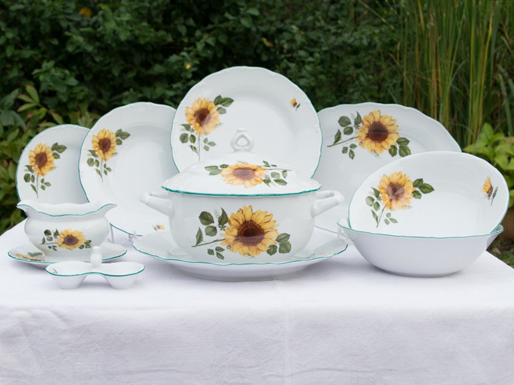 Jídelní souprava v klasickém tvaru Ofélie dekorovaná venkovským motivem se slunečnicí. Porcelánový servis používaný nejen na chatách a chalupách. Český porcelán s logem Moritz Zdekauer, které patří mezi tradiční značky českého porcelánu. Souprava se skládá z těchto dílů: talíř mělký 25 cm, 6ks talíř hluboký 23 cm, 6 ks talíř dezertní 19 cm, 6 ks polévková mísa 2,5 l, 1ks omáčník litý komplet 1 ks ...