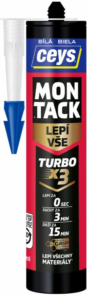 Montážní lepidlo Turbo s Full Grip. Díky exklusivní technologii, double grip lepí a fixuje ultra rychle a silně. Lepené díly drží po 15 minutách. Lepí všechny materiály pórezní i nepórézí, včetně speciálních a mokrých povrchů.Maximální přilnavost 400t/m2 .Extrémně rychle suché: Lepené díly drží po 15 minutách.Okamžitá přilnavost.Interiéry/exteriéry a dokonce i pod vodou.Pro povrchy pórezní a nepórezní, speciální povrchy.Odolává vlhkosti a teplotám -15ºC +90ºC.Vhodné pro materiályDřevo, beton, omítka, cihly, sklo, zrcadlo, kámen, mramor, dlaždice, polystyren, obklady, plast, korek, kov. Není vhodné na polyethylen PE, polypropylen PP, PTFE, křehké, nesoudržné, prašné, nepřilnavé podklady nebo na laky ve špatném stavu.