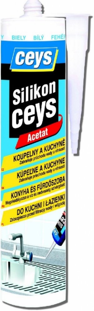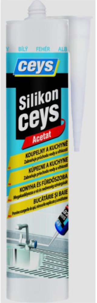 SILIKONCEYS je acetátový silikon, ideální pro tmelení spojů v kuchyních a koupelnách. Zabraňuje prosakování vody a vlhkosti. Použití: sanitární zařízení, kuchyňské linky, dřezy, vany, umyvadla, sprchové kouty, WC, obklady, pracovní desky, atd. spojuje se všemi konstrukčními materiály. Díky obsaženému fungicidu zajišťující odolnost proti plísni netma...