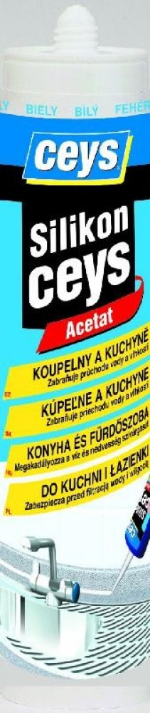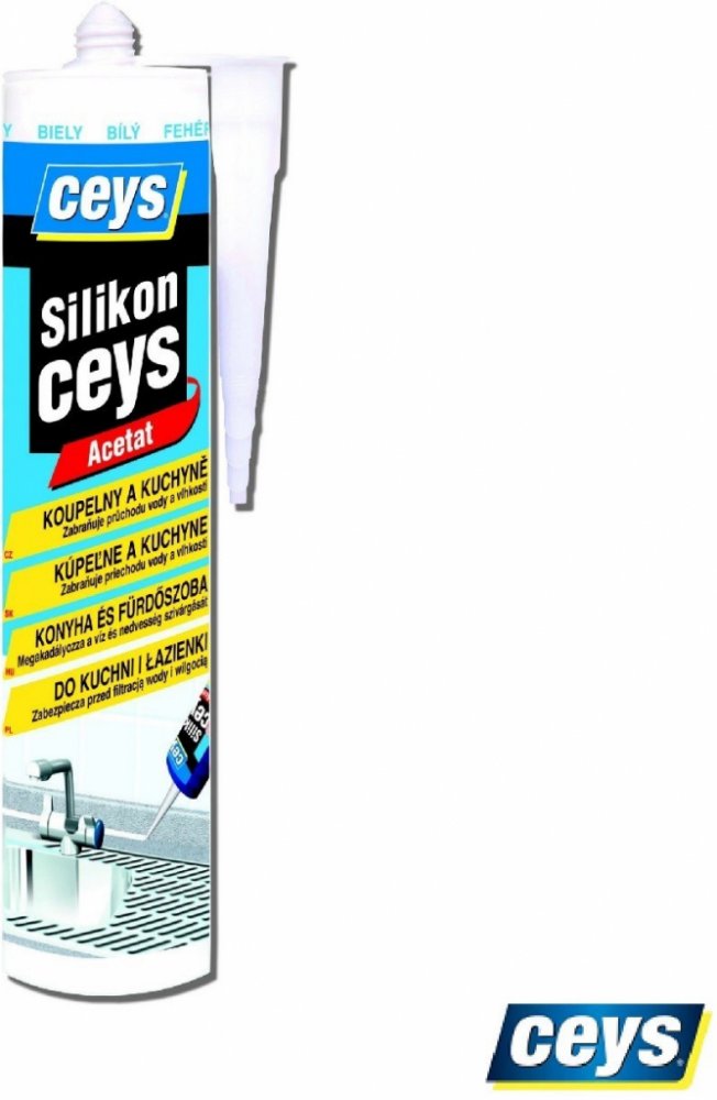 SILIKONCEYS je acetátový silikon, ideální pro tmelení spojů v kuchyních a koupelnách. Zabraňuje prosakování vody a vlhkosti. Použití: sanitární zařízení, kuchyňské linky, dřezy, vany, umyvadla, sprchové kouty, WC, obklady, pracovní desky, atd. spojuje se všemi konstrukčními materiály. Díky obsaženému fungicidu zajišťující odolnost proti plísni netmavne. Odolává vlhkosti, pracím práškům a mýdlům. Nesmrští se, neodlepí ani nepraskne.