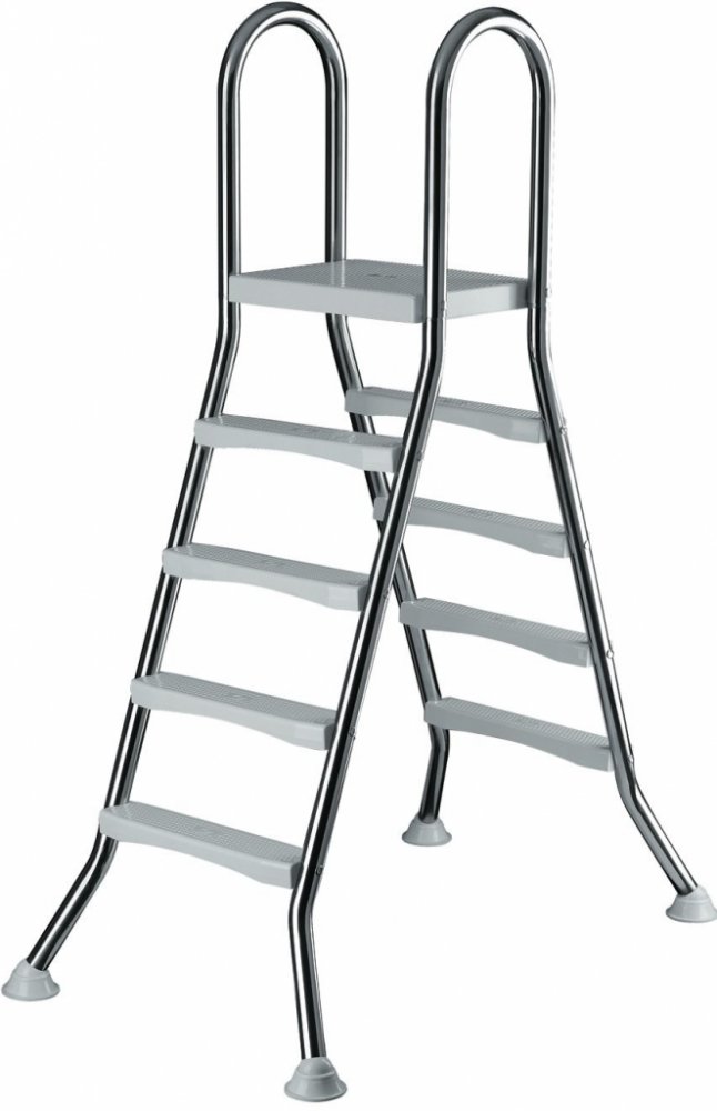 Bazénový žebřík pro bazény se stěnou až 122 cm, vyrobený z kvalitní nerezové oceli, která zajistí jeho dlouhou životnost. Žebřík má silné stabilní plastové schodnice a plošinu s protiskluzovou úpravou, udrží hmotnost až 150 kg. Žebřík má 4 stupně na vnitřní a vnější straně. Nohy žebříku jsou zakončeny koncovkami z protiskluzové gumy se stabilní podložkou, které zabraňují nechtěnému pohybu žebříku a zvyšují tak bezpečnost. Zároveň zabraňují poškození vašeho bazénu.