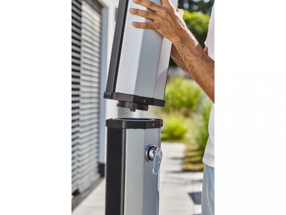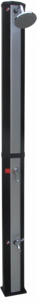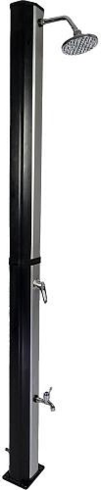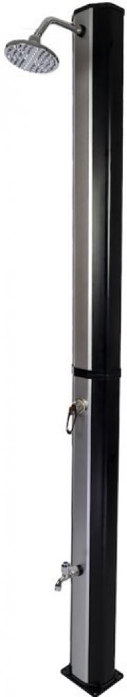 Velmi oblíbená solární sprcha s velkou sprchovací hlavicí, která zajišťuje příjemné sprchování připomínající lehký letní deštík. Sprcha je vyrobena z kvalitního PVC odolného vůči UV záření a díky přední části imitují nerez působí luxusním dojmem. Má XL zásobník o objemu 35 l, je vysoká 217 cm a je vybavena praktickým kohoutkem na oplach nohou. Připojení na přívod vody je velmi jednoduché pomocí hadicové rychlospojky (součástí balení). Sprcha je dvoudílná, takže ji lze lehce složit a převézt na jiné místo.