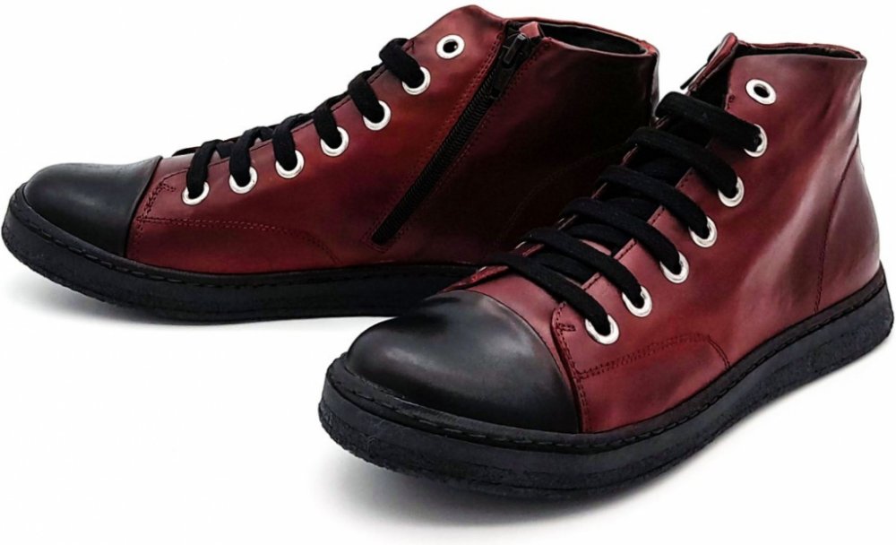 Dámské vínové celokožené tenisky. Vnitřek obuvi je rovněž kožený včetně komfortní stélky. Snadné nazouvání zajišťuje klasické šněrování a zip na vnitřní straně obuvi.