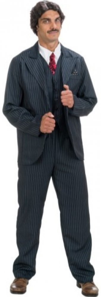 Tento pruhovaný černo-bílý oblek obsahuje vše, co k obleku patří. Sako s vestičkou, kalhoty s elastickým pasem, falešné bílé košile s kravatou (je tam pouze top) a kovovou sponu na kravatu.