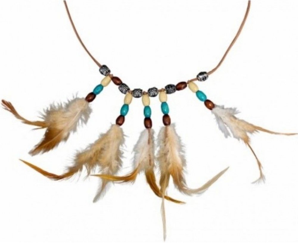 Karnevalový kostým indiána nebo indiánky je třeba stylově a tématicky doplnit různými drobnosti jako jr nspžíklad tento náhrdelník s peřím. Peříčka jsou v odstínech hnědé, béžové a bílé, které podtrhují její etnický charakter.