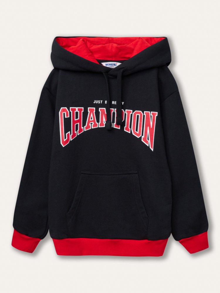 Chlapecká mikina s kapucí Champion v barvě černá. Ideální do podzimních měsíců. Zahřeje a potěší. Vyrobeno v Uzbekistánu z přírodního materiálu 100% bavlna. Látka je nečesaná teplákovina. Ve velikostech 122 - 170.