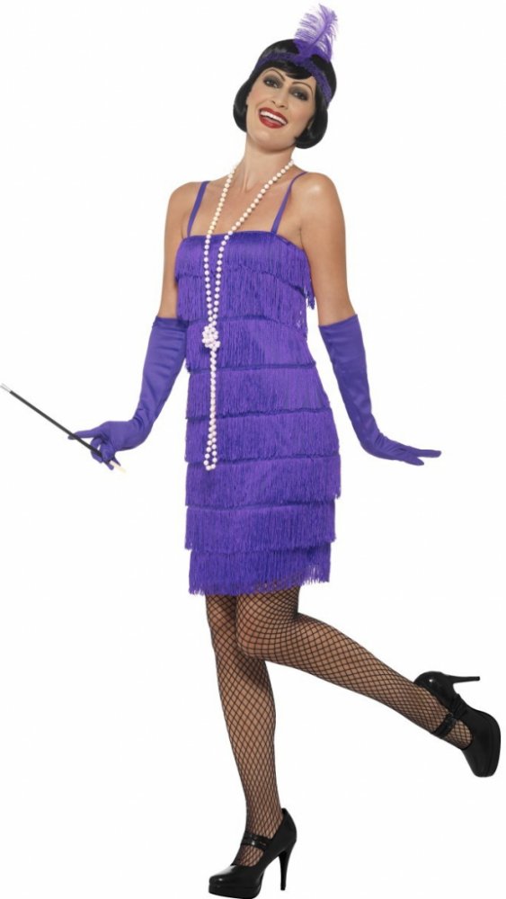 Zatančete si charleston na večírku ve stylu 30. let! Vaše pohyby krásně doprovodí třásně našité po celém obvodu šatů a váš vzhled flapper girl ještě více podtrhne flitrová čelenka a dlouhé rukavičky. Všechny doplňky jsou laděny do výrazné fialové, ve které zazáříte na každém mafiánském plesu či firemním večírku. Pro ještě detailnější vzhled můžete dámské šaty doplnit péřovým boa.