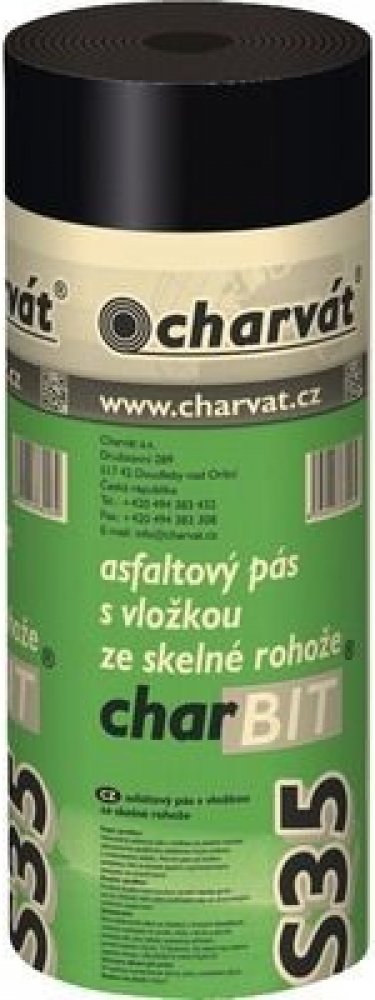 CHARVÁT asfaltový oxidovaný pás Charbit V60 S35je klasický natavitelný pás s nenasákavou nosnou vložkou ze skelné rohože, oboustranně opatřenou asfaltovou krycí vrstvou z oxidovaného asfaltu a separačními vrstvami z jemného minerálního posypu na straně horní a PE folií na straně spodní. Lze použít proti zemní vlhkosti, ne proti tlakové a gravitační vodě, jako mezivrstva hydroizolace střešních skla...