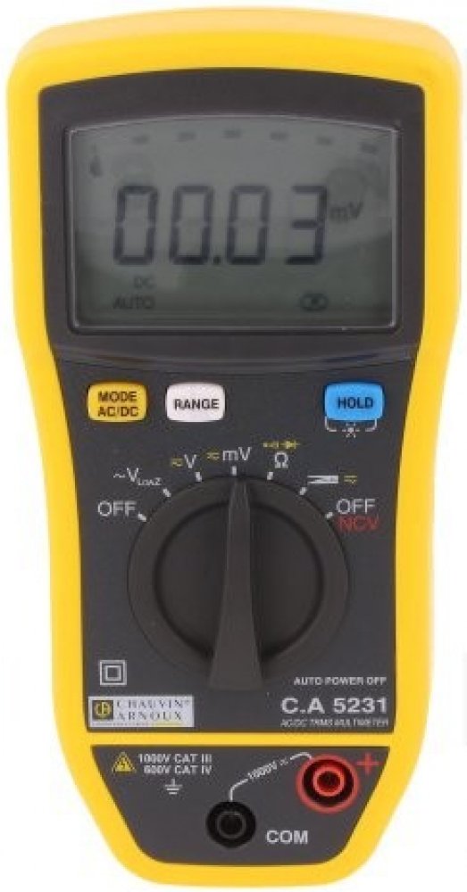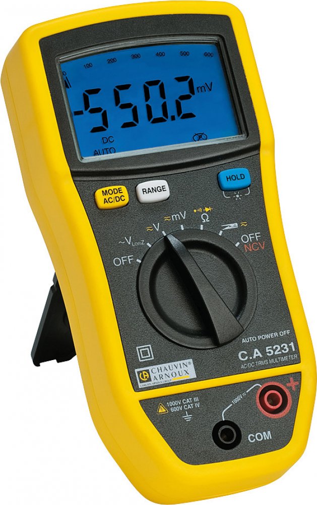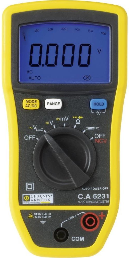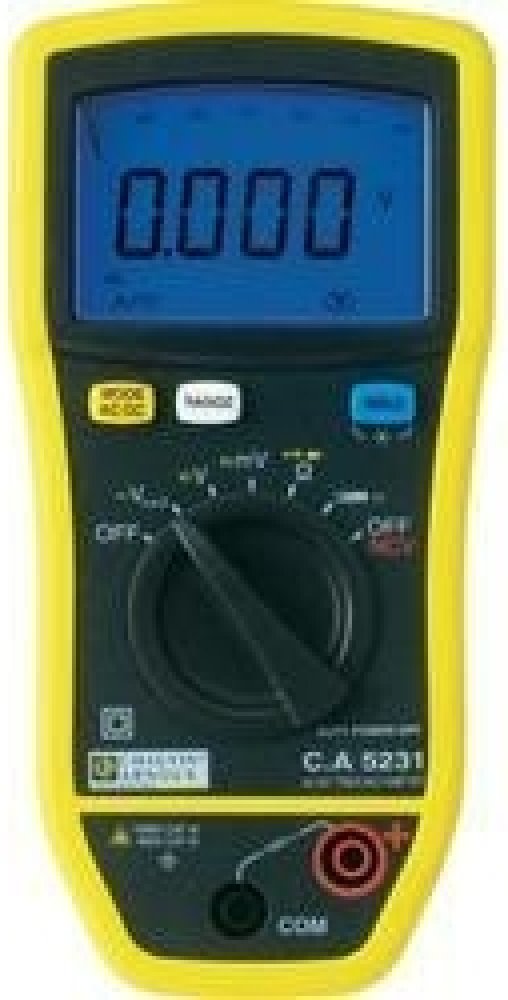 C.A 5231 je True-RMS digitální multimetr. Má displej s podsvícením, s max. čítáním 6000, s 61-segmentovým bargrafem. Nabízí automatické/manuální rozsahy, šířka pásma je 3 kHz (V) / 1 kHz (A), základní přesnost je 0,2%. U AC/DC do 1000V (6 rozsahů, rozlišení od 0,01mV); nízkoohmové měření AC napětí do 1000V / 4 rozsahy / rozlišení od 1mV. I AC/DC (měření kleštěmi) 600A / rozlišení 0,1A. R 60 MΩ / 6...
