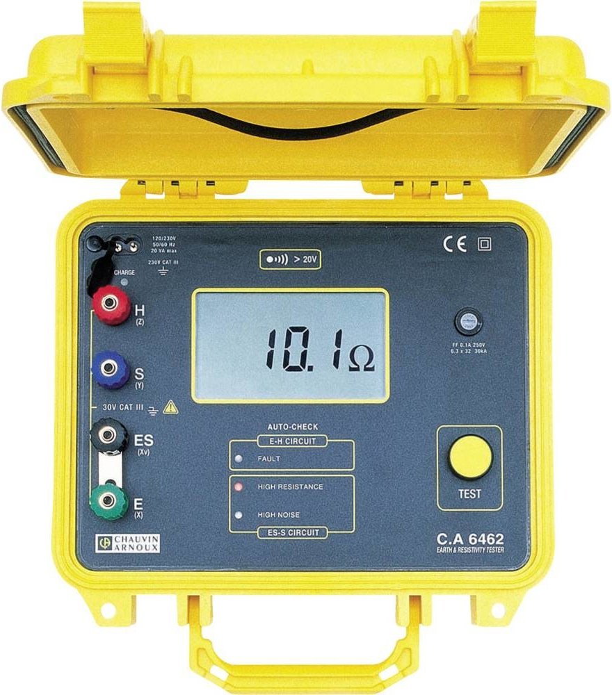 Měřič zemních odporů C.A 6462 je robustní a vysoce odolný, spolehlivý a snadno použitelný přístroj. Umožňuje snadné a bezpečné testování zemních odporů ve 3 automatických rozsazích a měření rezistivity půdy. Nabízí měření pomocí 4P i 3P metod. Integrovaný akumulátor napájí přístroj po velmi dlouhou dobu a usnadňuje provádění testů kdekoli potřebujete