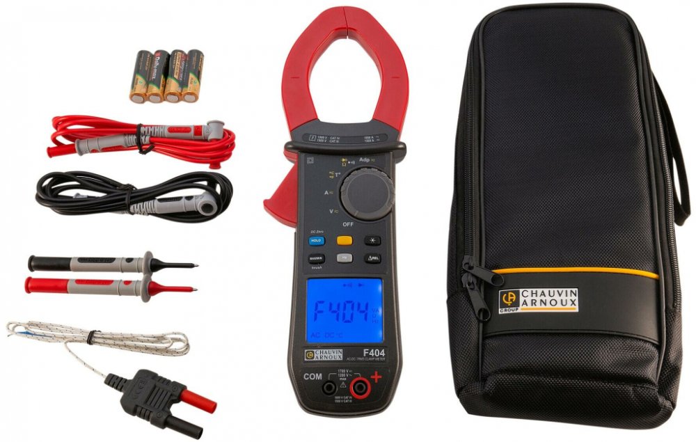 Klešťový multimetr F404, 2 ks prodlužovací vodiče, 2 ks měřicí hroty, termočlánek typ K, 1 ks přenosné pouzdro, 4 ks baterie 1,5 V a návod k obsluze v českém jazyce