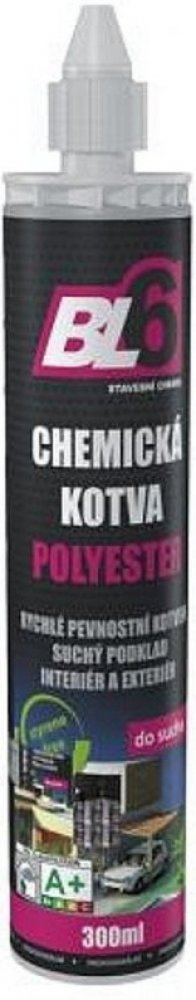 Charakteristika BL6 chemické kotvy polyester - kartuše 300mlChemická kotva vhodná na suchý podklad.Dvousložková polyesterová chemická malta bez styrenu.Malta nemá rozpěrnou sílu, má velkou mechanickou pevnost, reaguje i v uzavřených prostorách.Pro suché povrchy.Balení: kartuše 300ml.Použití BL6 chemické kotvy polyester - kartuše 300ml:Kotvení závitových tyčí, objímek, armovacích tyčí a obdobných., nejčastěji kovových profilů. Do většiny plných a dutých (nutné použití sítka) soudržných stavebn...