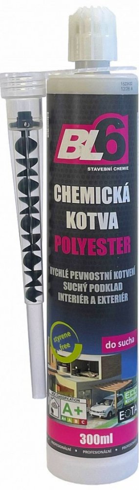 Charakteristika BL6 chemické kotvy polyester - kartuše 300 mlDvousložková polyesterová chemická malta bez styrenu.Malta nemá rozpěrnou sílu, má velkou mechanickou pevnost, reaguje i v uzavřených prostorách.Pro suché povrchy.Balení: kartuše 300 ml.Použití BL6 chemické kotvy polyester - kartuše 300 mlKotvení závitových tyčí, objímek, armovacích tyčí a obdobných., nejčastěji kovových profilů. Do většiny plných a dutých (nutné použití sítka) soudržných stavebních materiálů – cihla, beton, kámen apod.Aplikace BL6 chemické kotvy polyester - kartuše 300 mlZ vyvrtaného otvoru odstraňte zbytky prachu, z kartuše odšroubujte krycí víčko, našroubujte aplikační směšovač a vložte do nanášecí pistole.Prvních cca 10 cm vytlačené chemické malty nepoužívejte – dokonalé promíchání poznáte jednotnou šedou barvou.Otvor naplňte do poloviny hloubky (u dutých materiálů nejprve vložte sítko a vyplňte ho celé), otáčivým pohybem vložte kotvený prvek do konečné polohy – v závislosti na teplotě lze po omezenou dobu se spojem částečně manipulovat.SpecifikaceTeplotní odolnost: –30°C až +80°C.Aplikační teplota: +5°C až +35°C.