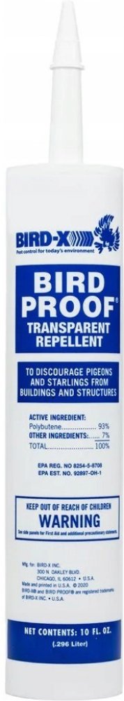 Gel Bird Proof je bezbarvý čirý gel, který zabrání dosedávání ptactva na parapetech, zábradlí, balkonech, římsách, sochách, reklamních tabulích, krovech atd. Mechanická zábrana - lepivý gel dokáže úspěšně zabránit ptactvu v dosedání a znečišťování na chráněných plochách. Velmi snadné použití - GEL BIRD PROOF vymáčknete na požadovaná místa, která chcete ochránit - na parapety, zábradlí, okapy atd.