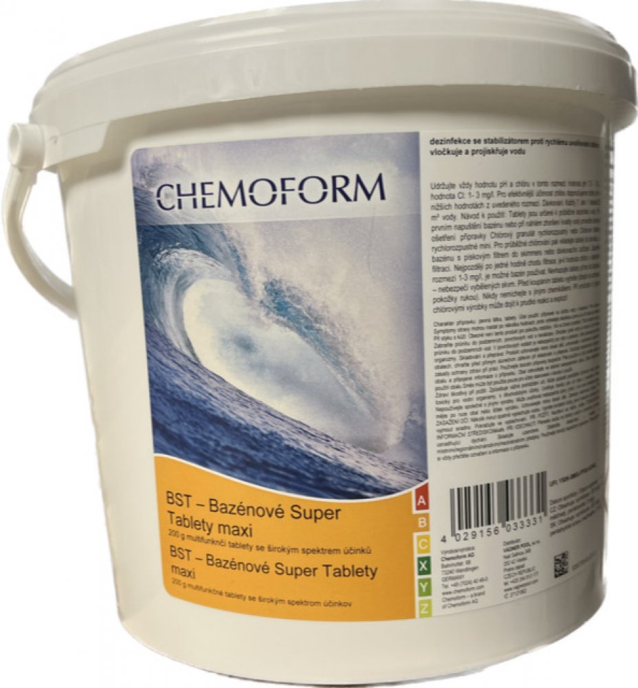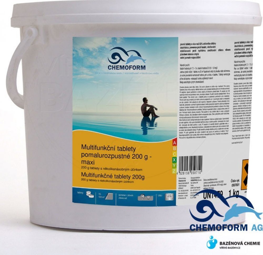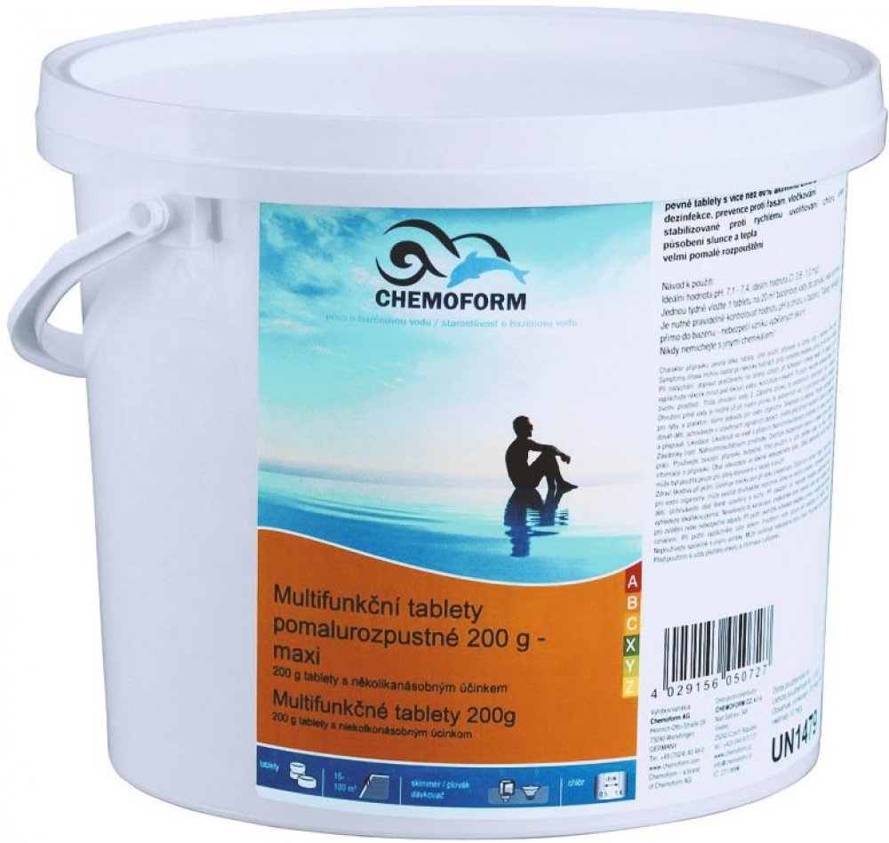 Používejte biocidy bezpečně. Před použitím si vždy přečtěte etiketu a informaci o výrobku. Tablety s vícenásobným účinkem. Jsou složeny ze tří hlavních složek - chlorová dezinfekce, algicidní látka a vločkovače. Vhodné pro dlouhodobou údržbu bazénů. Chlór likviduje bakterie a viry, rozkládá nežádoucí látky, algicid zamezuje růstu řas a vločkovač sráží mikroskopické znečištění do vloček schopných se zachytit na běžných filtračních zařízeních. Jsou vhodné i pro malé bazény. Popis výrobku - etiketa