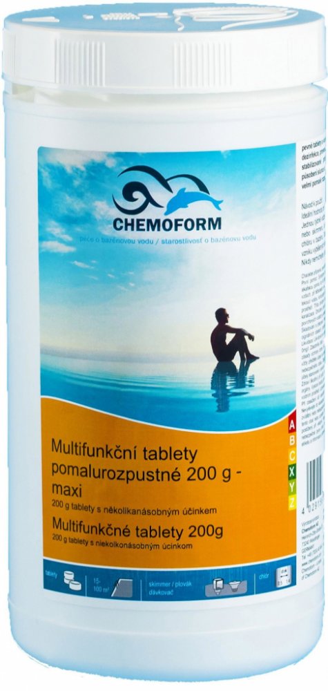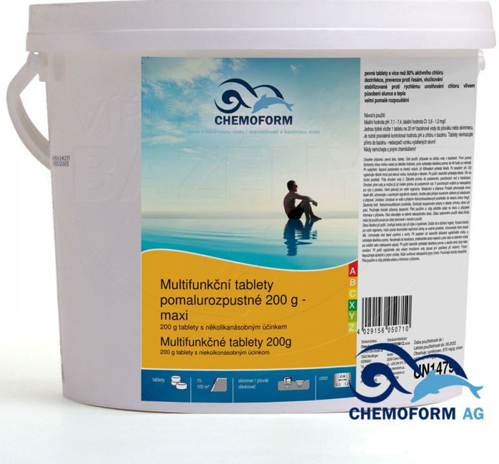 Tablety s několikanásobným účinkem obsahují více jak 80% aktivního chloru, preventivní dávku proti řasám a vločkovací přípravek(pro zvločkování drobných nečistot). Stabilizovaný přípravek proti rychlému uvolňování chloru vlivem působení slunce a tepla, ničí zárodky a bakterie. Velmi pomalé rozpouštění, vhodné zejména pro dlouhodobé a preventivní ošetřování průzračné bazénové vody.