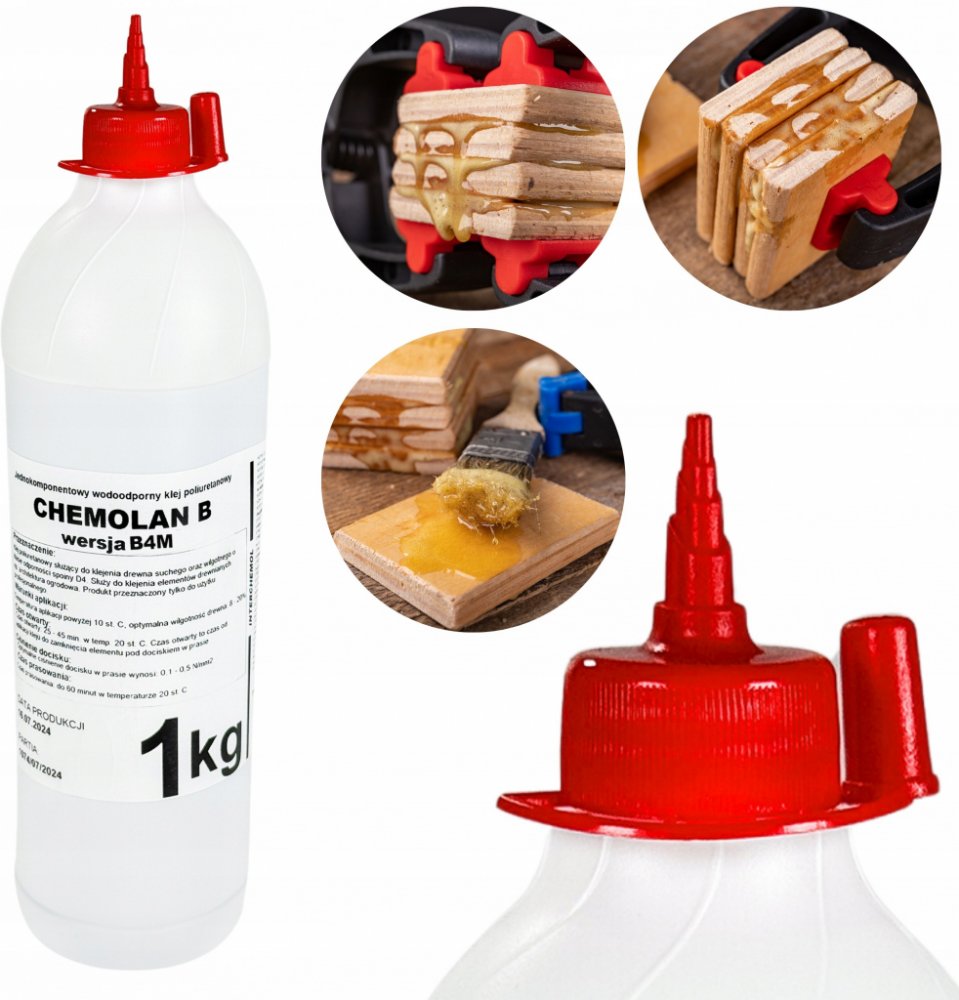 Chemolan B4/M je jednosložkové polyuretanové lepidlo, které vytvrzuje vlivem vlhkosti ze vzduchu. Vyznačuje se vysokou odolností proti vodě, nízkým teplotám a vynikající trvanlivostí, splňující normu D4. Je ideálním řešením pro lepení vlhkého dřeva, zejména při výrobě nábytku, stavebního truhlářství a dalších dřevěných spojů, které vyžadují odolnost vůči povětrnostním vlivům.