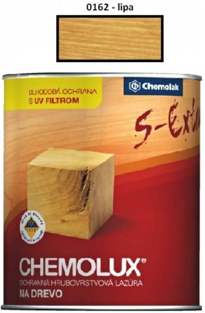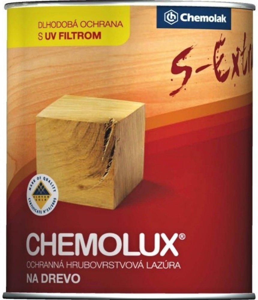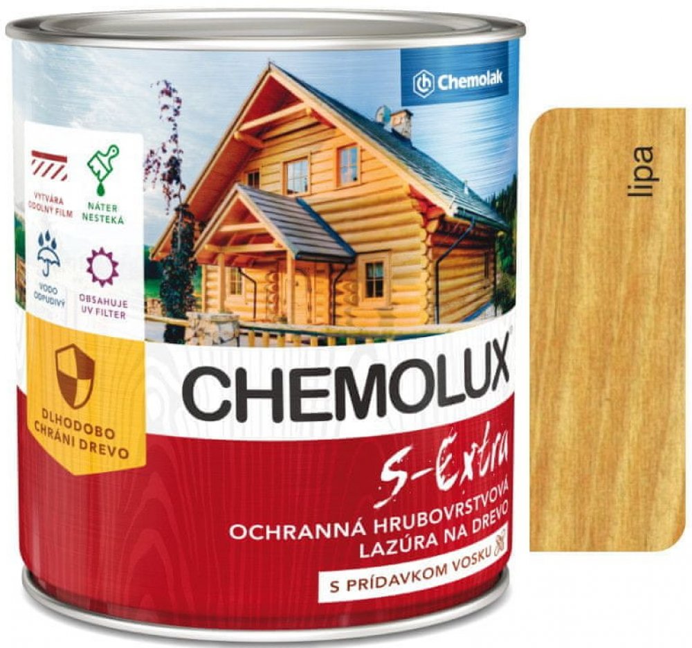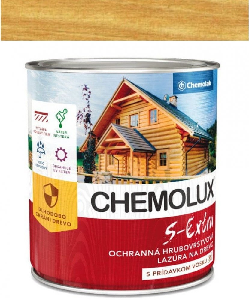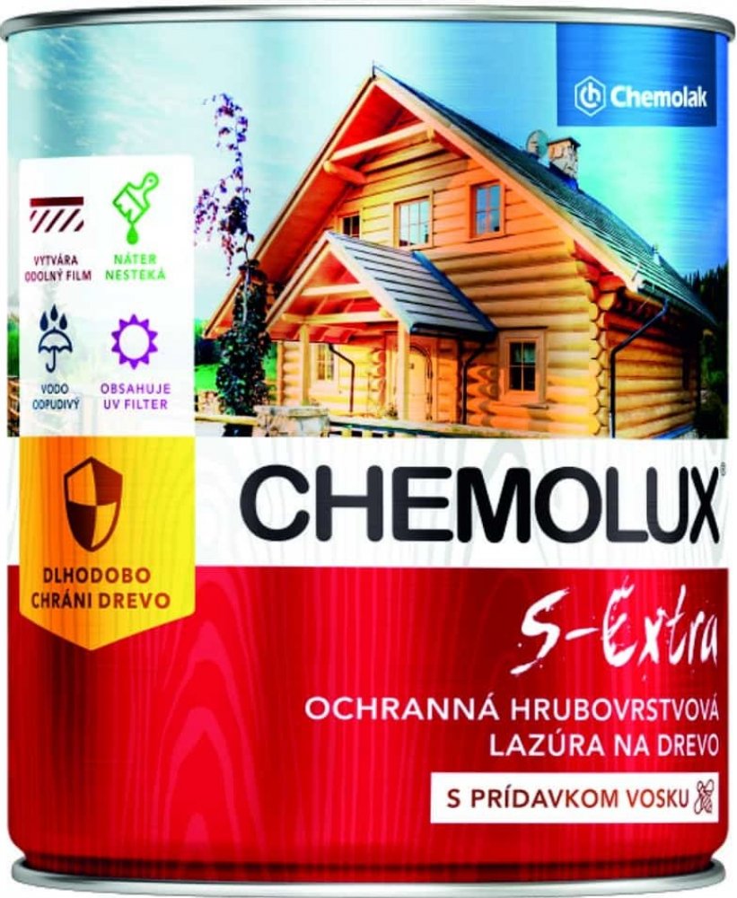 Rozpuštědlová lazura na povrchovou úpravu dřeva pro venkovní i vnitřní použití, nátěry chat, oken, podlah, plotů a pod. Na povrchu natíraného podkladu vytváří hrubší vrstvu, která odpuzuje vodu a dlouho chrání dřevo před působením vlhkosti, povětrnostními vlivy a UV zářením. Svými vodoodpudivými vlastnostmi zvyšuje rozměrovou stabilitu dřeva, speciální pigmenty a aditiva snižují vliv UV záření a tak zabraňují fyzikálněchemické degradaci dřevěné hmoty. CHEMOLUX S – Extra dřevo barevně upravuje a zvýrazňuje jeho přirozenou krásu. Nestéká a lehce se aplikuje na svislých plochách. Nepoužívat na nátěry přicházející do kontaktu s potravinami, krmivy, pitnou vodou, natírání dětského nábytku a hraček.