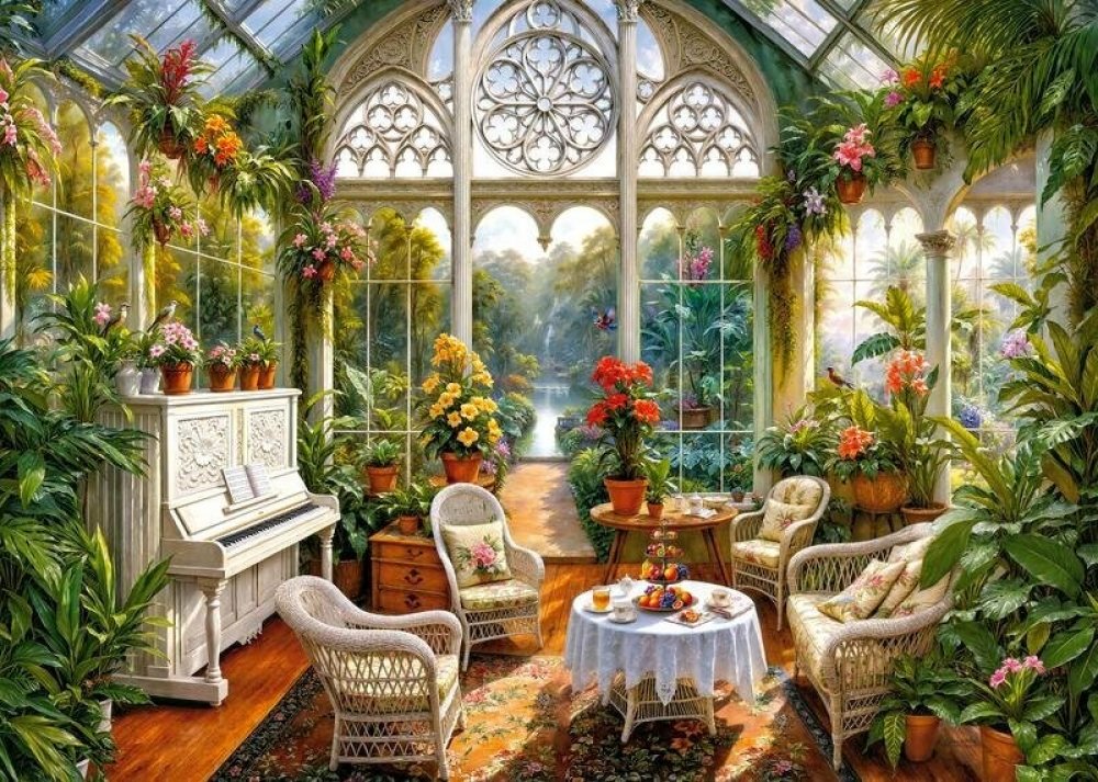 Motiv Garden Sonata vás přenese do nádherné zimní zahrady, kde se snoubí elegance klasické architektury s bujnou zelení a útulnou atmosférou. Detailní zpracování každého koutu obrazu – od romantických arkádových oken přes pestré květiny až po útulný nábytek a dekorace – zaručuje, že každý dílek bude objevem. Po složení získáte úchvatné umělecké dílo, které si zaslouží čestné místo na vaší zdi.