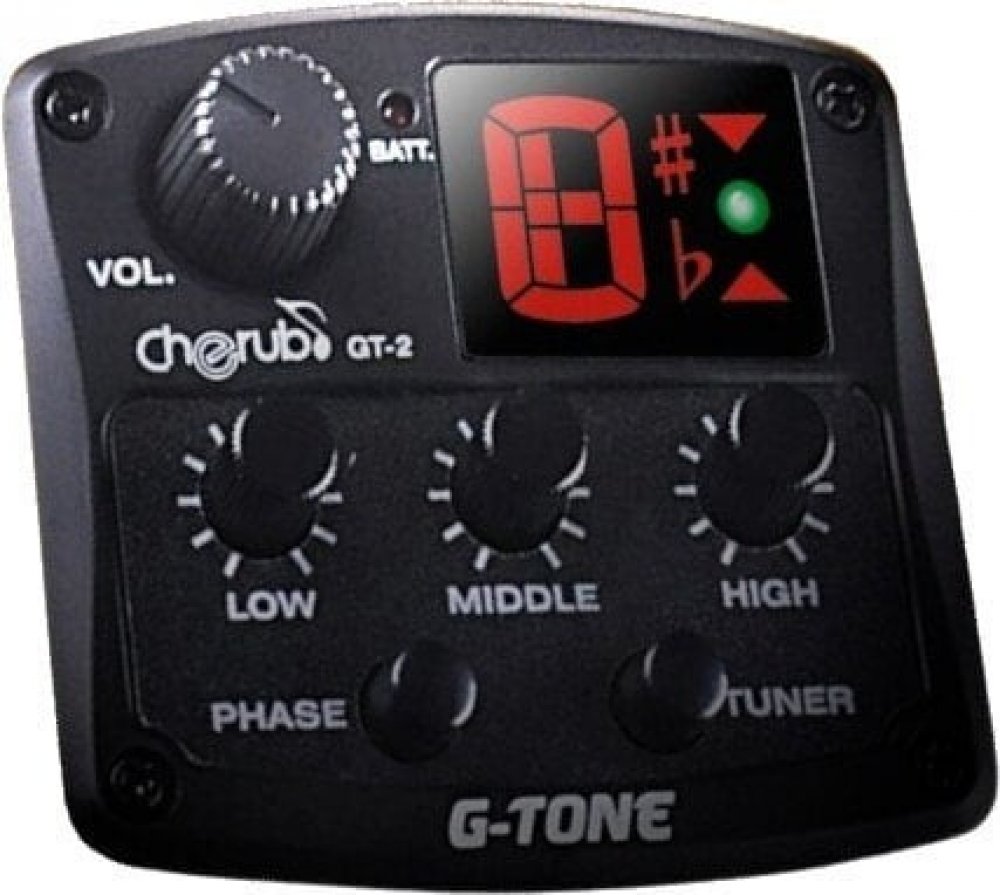 GT-2 je všestranný palubní kytarový předzesilovač a ekvalizér, který bezproblémově integruje základní nástroje pro akustické kytaristy. Tato jednotka kombinuje 3-pásmový EQ, chromatickou ladičku a fázový efekt, vše v designu, který se mimořádně snadno instaluje do kytary. Obsahuje také automatickou detekci nabití baterie pro pohodlnou správu napájení.Integrovaná funkcionalita: GT-2 nabízí komplexní soubor funkcí včetně citlivého 3-pásmového ekvalizéru, přesné chromatické ladičky a fázového efektu, které poskytují hudebníkům všestranné možnosti tvarování tónu a ladění.Snadná instalace: Tento systém je navržen pro přímou integraci a lze jej velmi snadno nainstalovat do vaší akustické kytary, což umožňuje rychlé vylepšení elektroniky vašeho nástroje.Automatické monitorování baterie: Vybaven automatickou detekcí nabití baterie, GT-2 poskytuje LED indikátor nízkého stavu baterie, což zajišťuje, že jste si vždy vědomi stavu napájení.Parametry:Vlastnosti: 3-pásmový EQ / chromatická ladička / fázový efektVstupní impedance: 10MΩFrekvenční odezva: 20Hz-20kHzRozsah ovládání:Nízké: $\pm12$dB při 100HzStřední: $\pm12$dB při 800HzVysoké: $\pm12$dB při 4kHzSnímač: Piezo keramický snímačVýstupní konektor: 6.35mmLED kontrolka slabé baterie: AnoŽivotnost baterie: Přes 100 hodinNapájení: 9V alkalická baterie