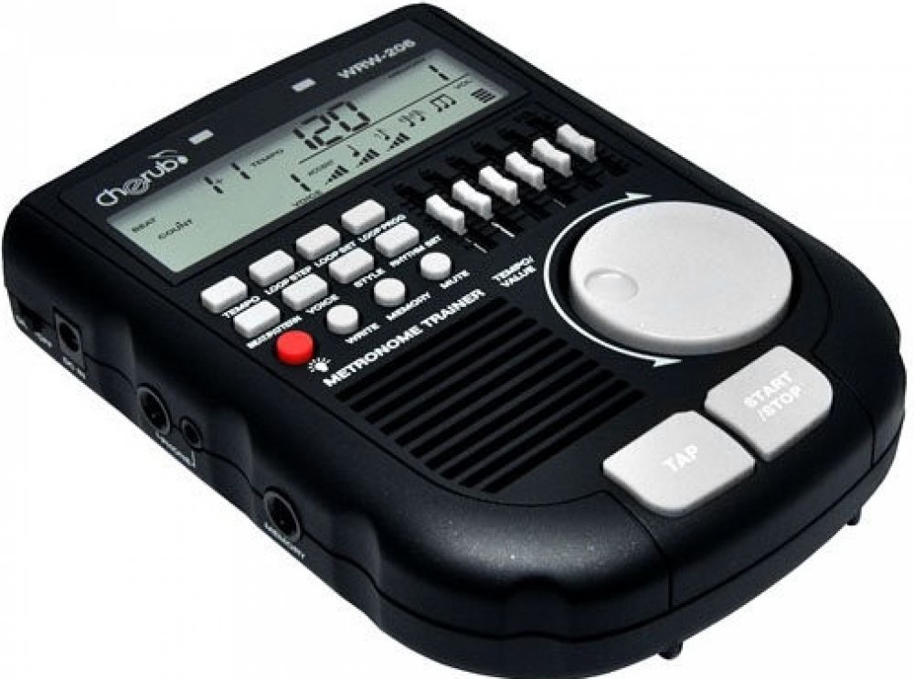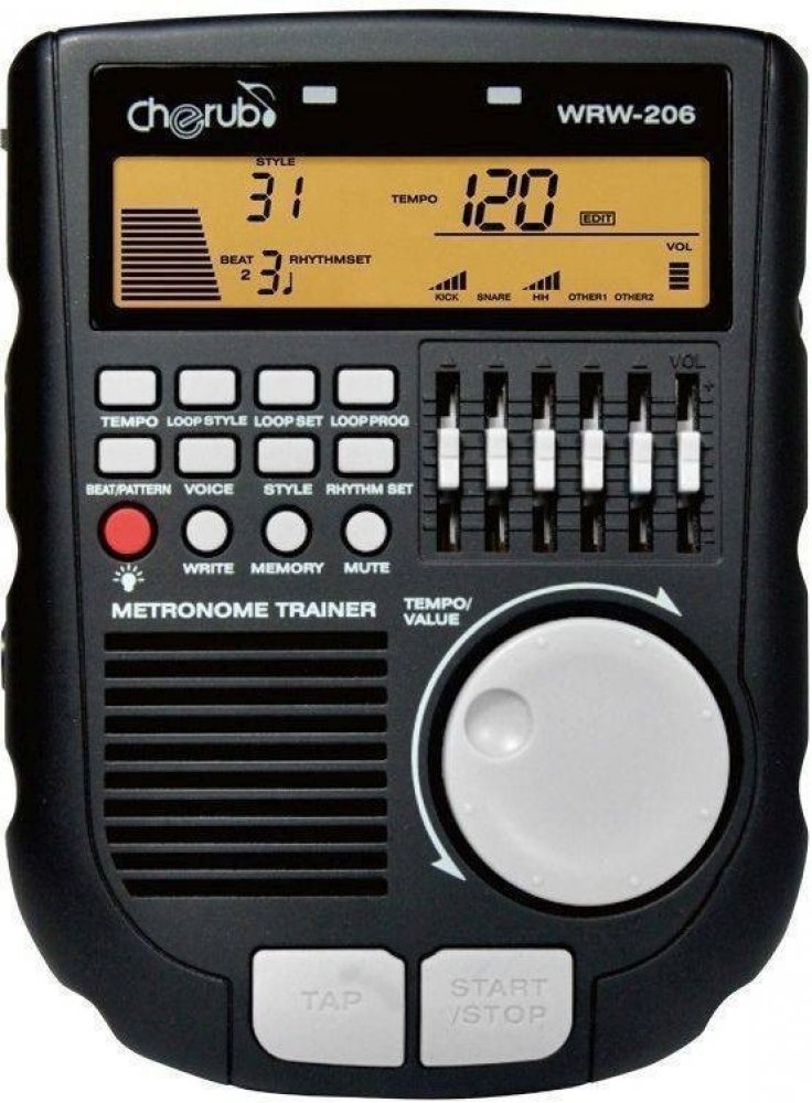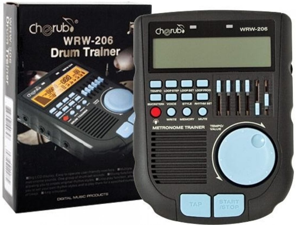Cherub WRW-206 - digitální, bubenický metronom s velkým LCD displejem a jednoduchým ovládáním.Specifikace: - velký LCD displej (volitelně podsvícený)- velké datakolečko - tap funkce pro rychlé nastavení tempa - několik zvuků metronomu - zvuky bicí soupravy - mixování umožňující vytvoření originálních rytmických stylů (5 tahových potenciometrů + master volume) - funkce přehrávání smyček Loop play v uživatelem zadaném počtu opakování - simulátor zesilovače pro kytarový vstup - paměť k uklá