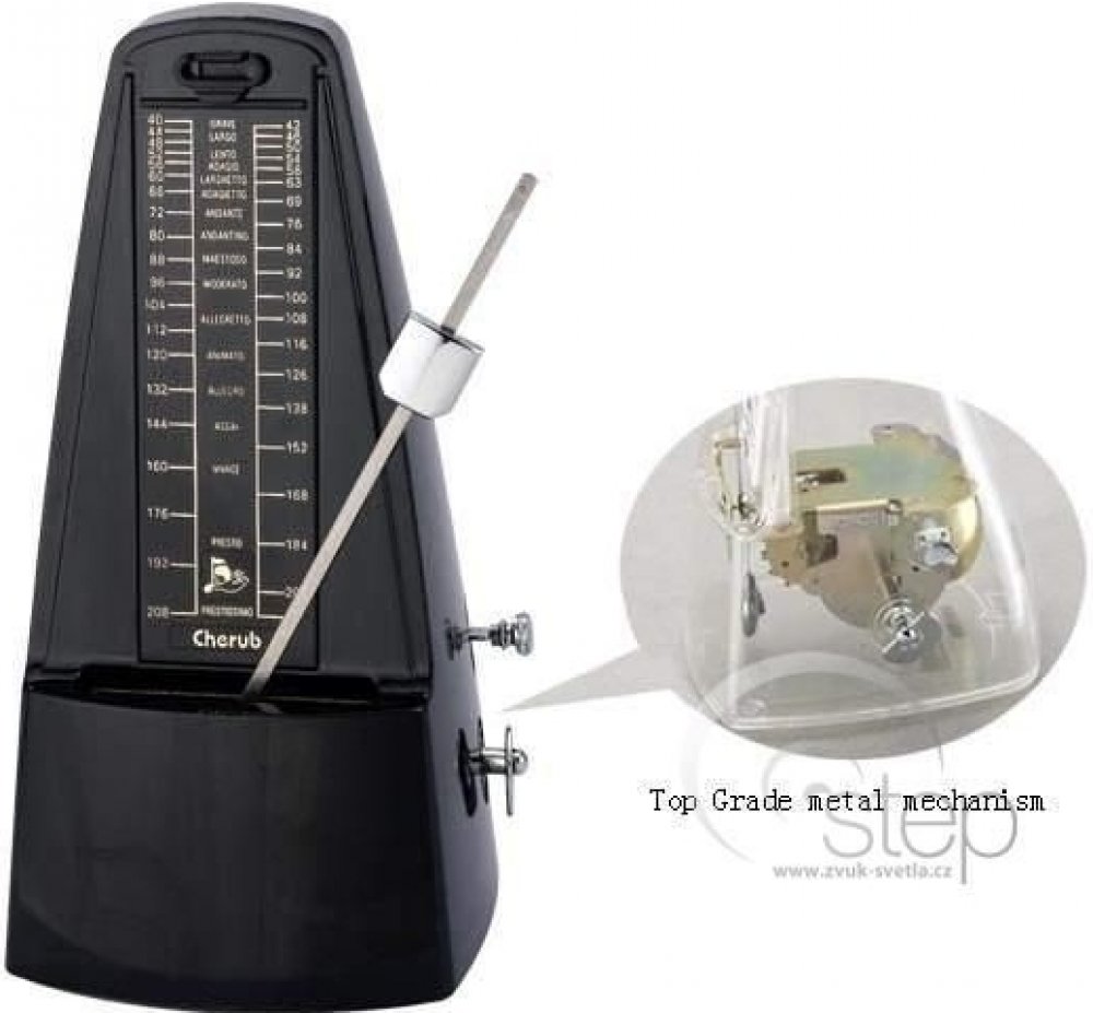 Klasický mechanický metronom v elegantním a moderním plastovém provedení. Rozsah nastavení tempa je od 40 - 208 BPM, možnost nastavení důrazu na zvýraznění doby 0-6 pomocí vestavěného zvonečku. Kompletní mechanismus kovový, provedení černé.