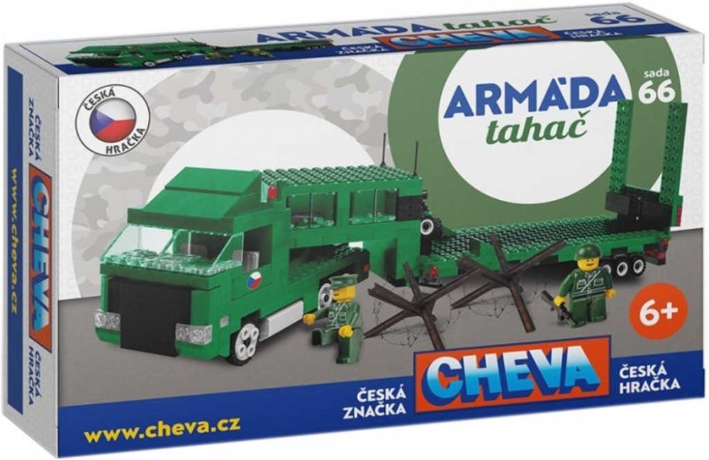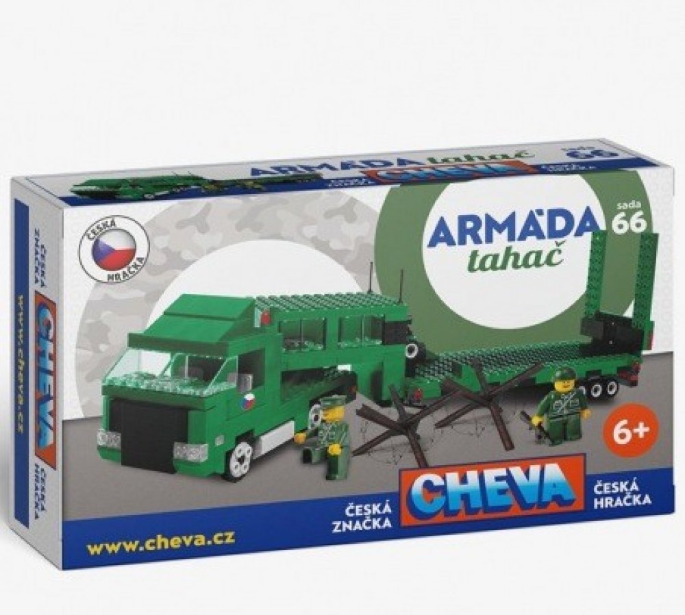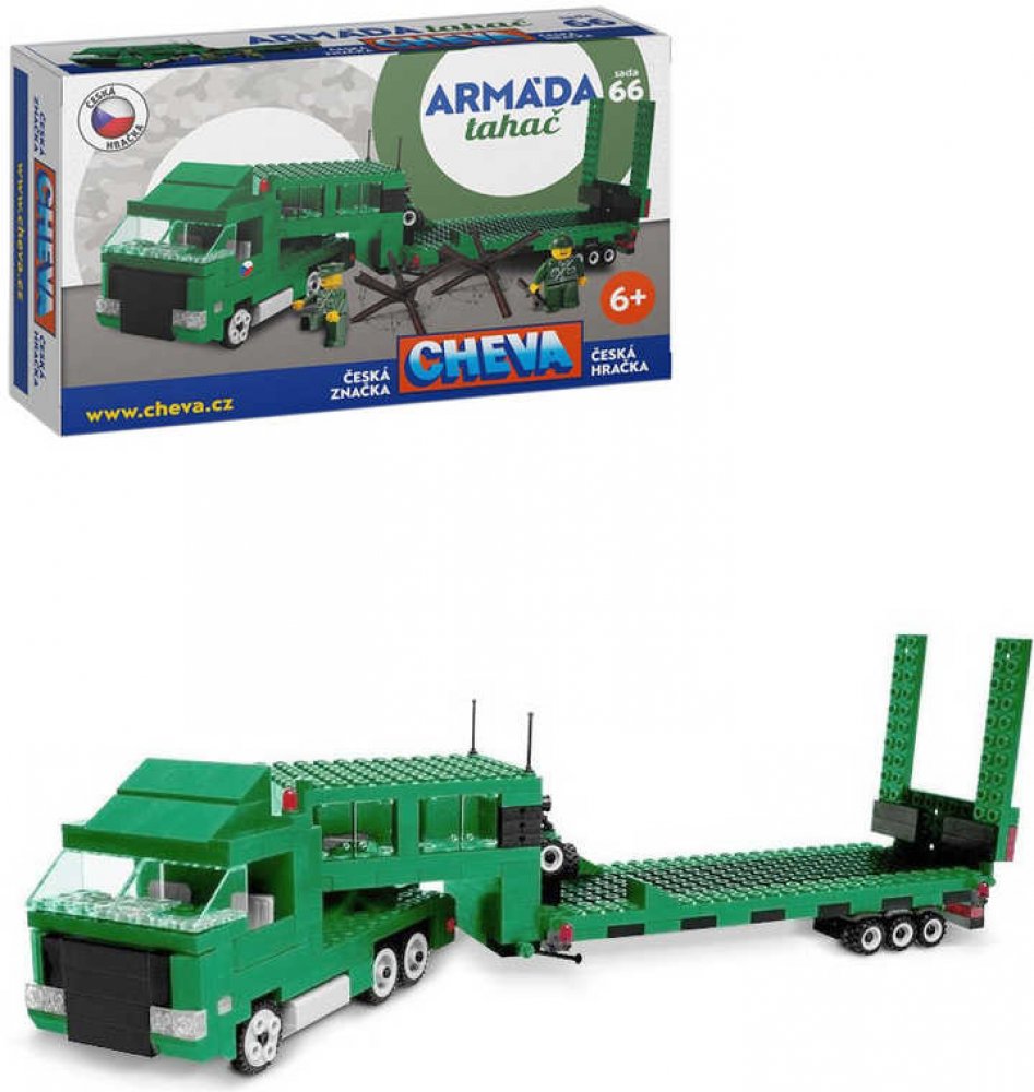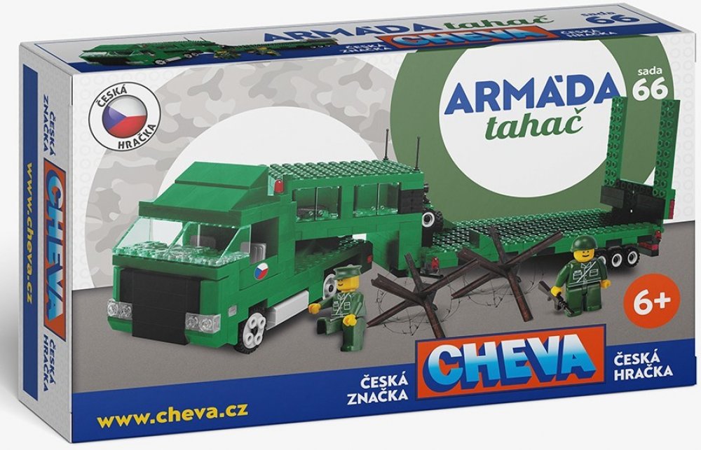 Stavebnice Cheva 66 obsahuje více jak 500 dílků, z nichž lze sestavit Tahač těžké vojenské techniky a přenést se tak do světa válečných bitev.