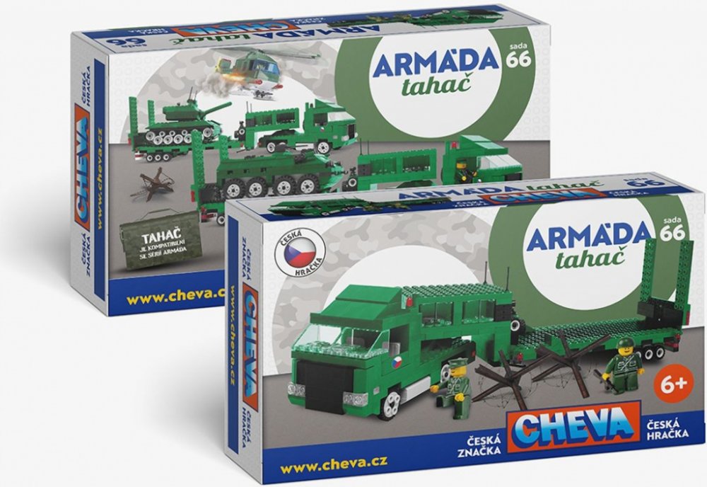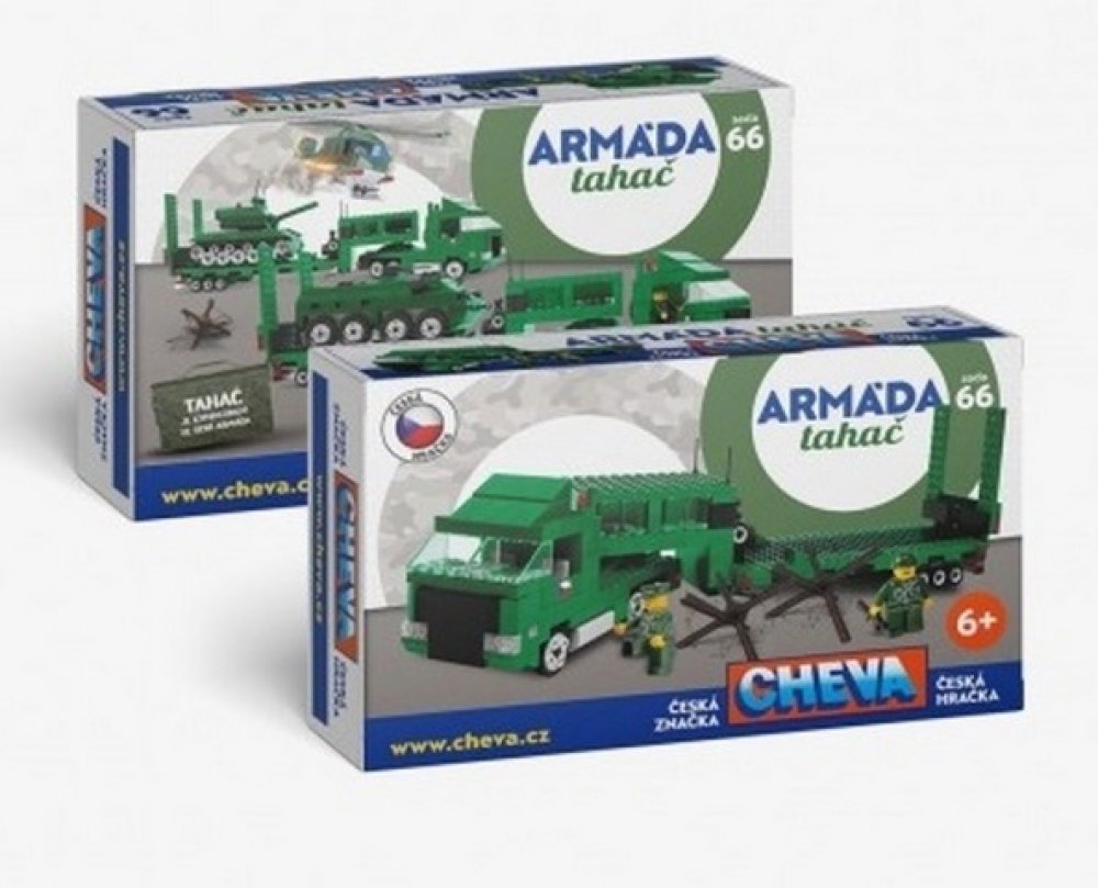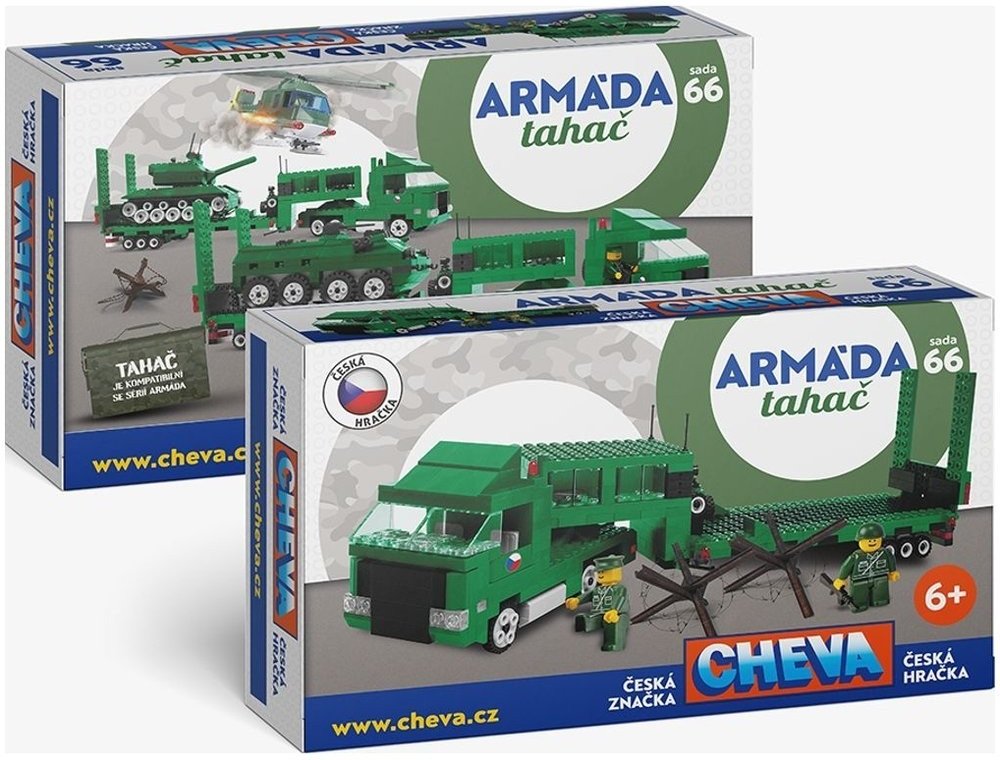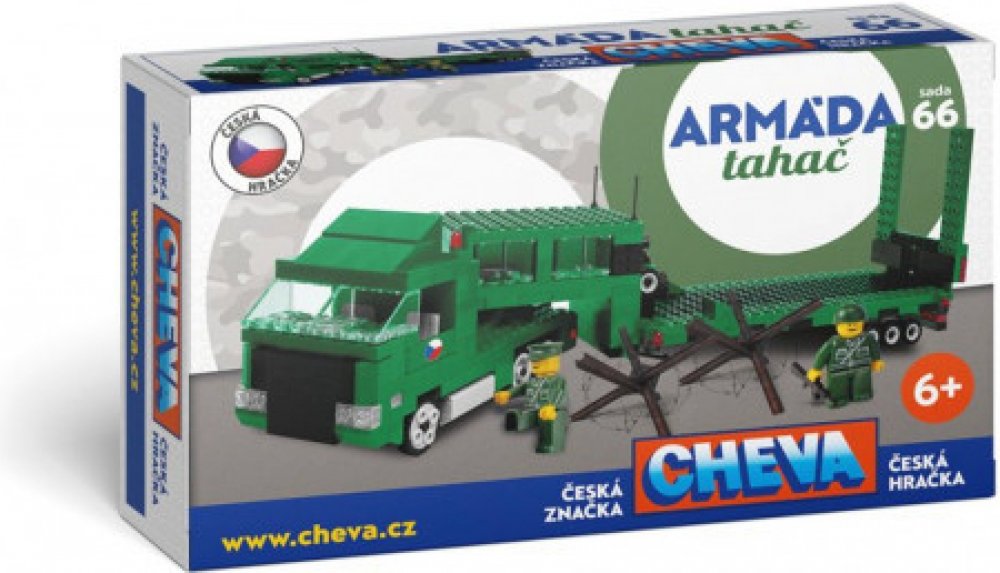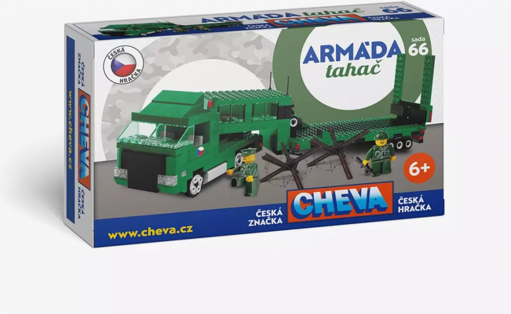 Stavebnice Cheva 66 obsahuje více jak 500 dílků, z nichž lze sestavit Tahač těžké vojenské techniky a přenést se tak do světa válečných bitev.