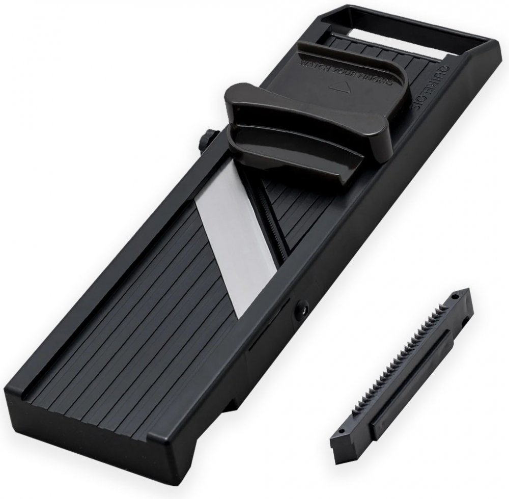 Určitě jste již přemýšleli, jak se připravuje zelenina a ovoce, které zdobí pokrmy v japonských a asijských restauracích. Tajemství spočívá v tomto profesionálním ručním kráječi. Každou zeleninu, ovoce, nebo zelí nakrájíte na mandolíně během několika minut. Jednoduchým pootočením kolečka získáte sílu krájených potravin od 0,5 mm do 3 mm. Lze krájet potraviny až do šířky 67 mm. S touto mandolínou uděláte jak plátky, tak i nudličky ve dvou různých šířkách 1 mm a 2,5 mm.