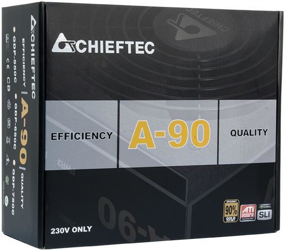 Chieftec A90 Series GDP-750C odpovídá specifikaci Intel ATX 12V v2.3 a je určen pro provoz v elektrických rozvodech 200 – 240 V. Poskytuje maximální stálý výkon 750 W a je vhodný pro pracovní stanice i náročné herní počítače. Nechybí mu podpora pro moderní vícejádrové procesory Intel a AMD či moderní grafické karty NVIDIA a AMD.