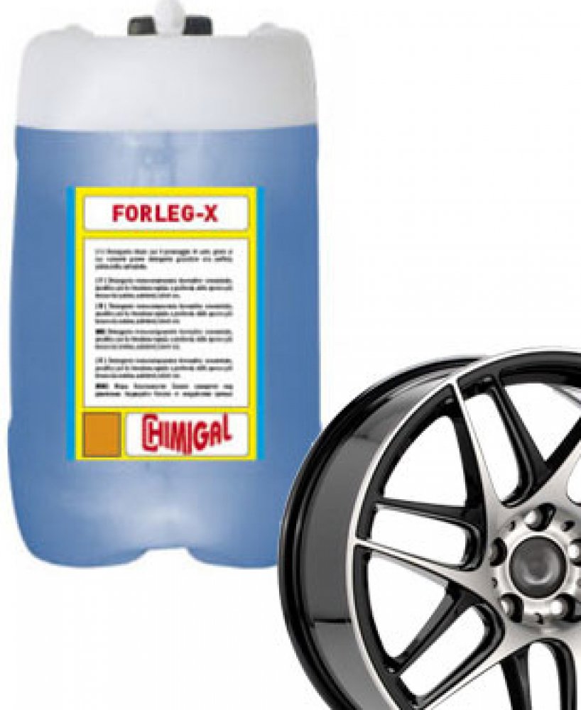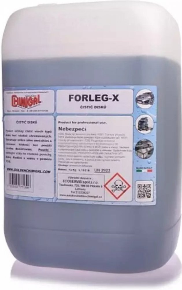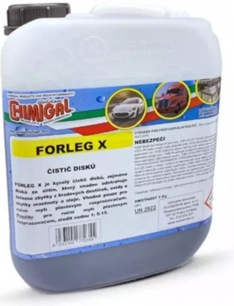 Kyselinový čistič disků kol pro myčky automobilů. Vysoká účinnost na neudržované disky automobilů. Velice snadno a rychle odstraňují brzdný prach a zežloutnutí z alu disků a plastových poklic. Forleg X neničí pryžové části a pneumatiky. Díky vysokému koncentrátu naředíte až 120 litrů velice účinného čističe.