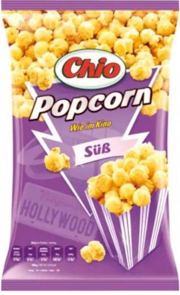 popisjako v kiněznačkaChioProdejní obsah / produktivita120 gLegální jménoPopcorn, sladkýKontaktIntersnack Knabber-Gebäck GmbH Co.KG, Erna-Scheffler-Str 3, 51103 Kolín nad RýnemNutriční informace100 g každý (nepřipravený)za porci (nepřipravený) / RDA (v)Energie v kJ / kcal1,827 / 432554/131Tuk (vg)5.91,8 / 3dále: nasycené mastné kyseliny0,70,2 / 1Sacharidy (vg)8927/10z toho cukry5316/18Protein (vg)...