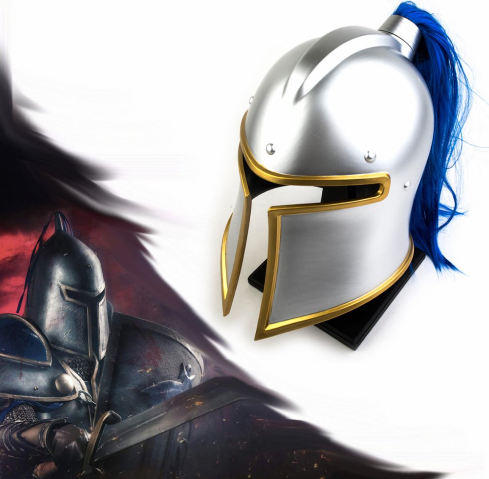 Lidé v alianci, uskupení mnoha ras, které ctí mír a světlo, museli vyvinout dostatečně silné brnění, aby mohli odolávat nájezdům orků či jiných silnějších nepřátel. Zde vidíte nádhernou repliku přilby 1:1 i se stojánkem!