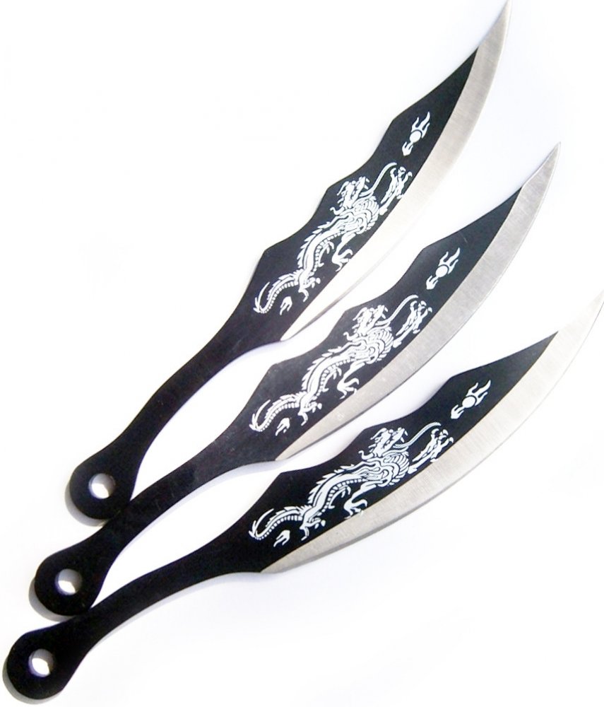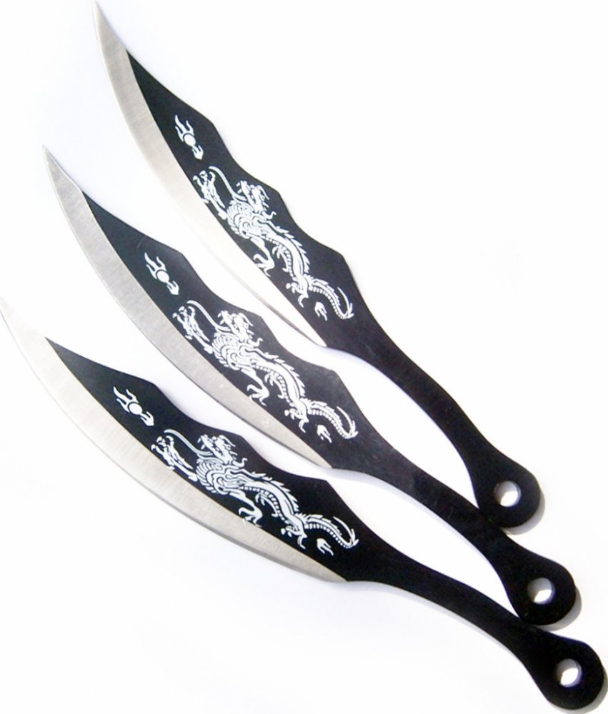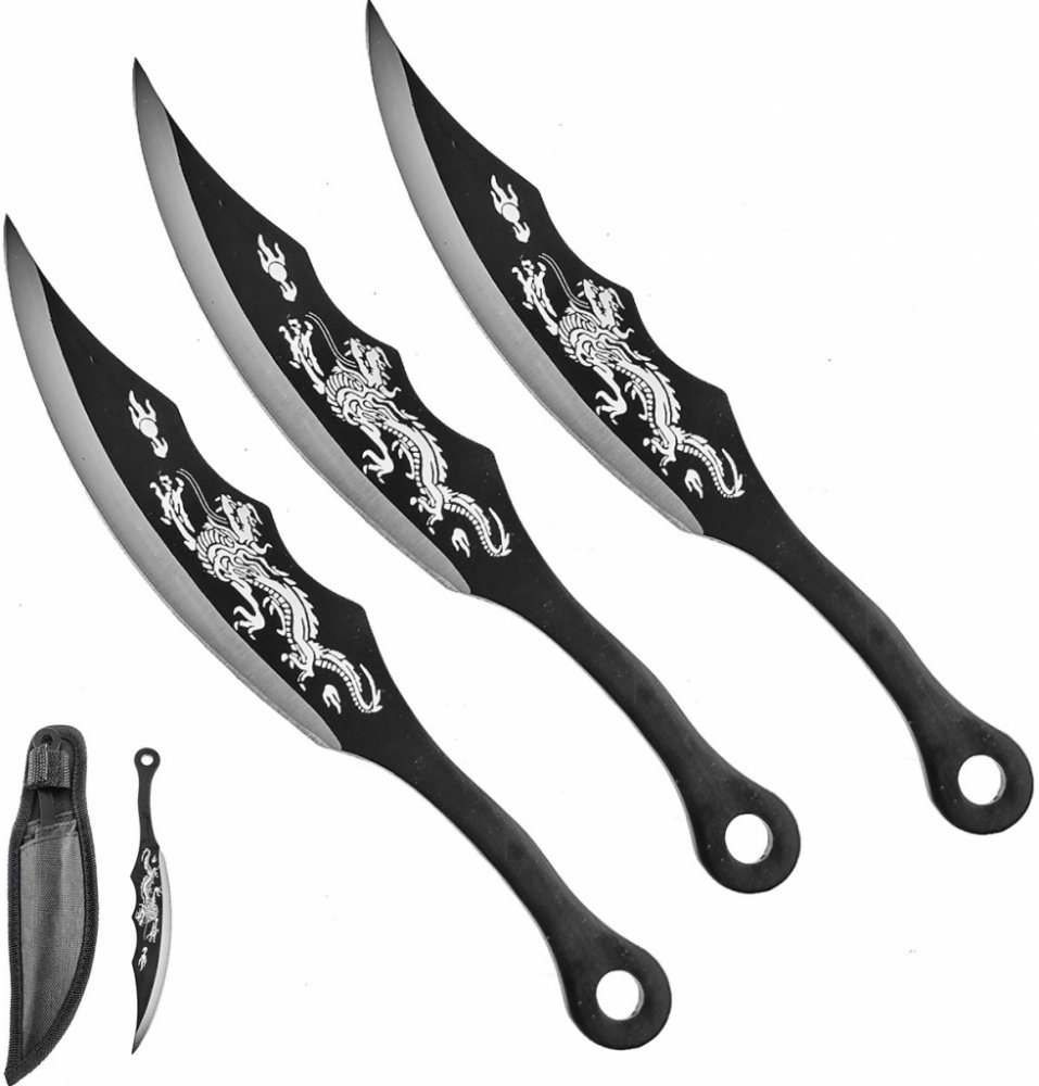 Vrhací nože "BLACK DRAGON" jsou kvalitní nože z nerezové oceli šavlovitého tvaru! Tyto se Vám budou zabodávat jedna radost!3 kusy Vám zaručí, že vrhání nožem může být i zábava - nebudete muset chodit pro nůž po každém hodu! ;-) Jsou dodávány se stylovým pouzdrem, díky kterému je můžete bezpečně nosit u sebe.