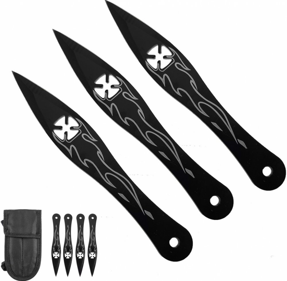 Každý nůž je výrazně ozdoben stříbrným plamenem a čtyřhranem, což dodává zbraním nezaměnitelný a výjimečný vzhled. Součástí balení je pevné pouzdro z nylonu v černé barvě, které zajišťuje bezpečnější uložení nožů a snadné přenášení. Celkově tato sada vrhacích nožů se stane vaším tajným zbraním pro sportovní hry a relaxaci v přírodě.