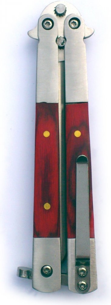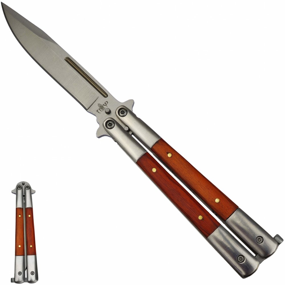 Elegantní rychle se rozkládací nůž (tzv. balisong) s rukojetí vykládanou exotickým dřevem!