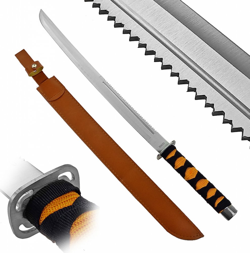 Katana/mačeta "MODERN SAMURAI" měří optimálních 70 cm, což je velmi slušná délka na mačetu, zbraň je však o poznání skladnější než klasická katana a snáze se s ní manipuluje. Čepel je vyhotovena z nerezové oceli a na vrchu disponuje pilkou pro široké využití. Rukojeť díky klasickému opletu saje pot, pohodlně se drží, má tu správnou délku a navíc pěkně vypadá! Katana/mačeta má praktickou záštitu pro ochranu prstů.