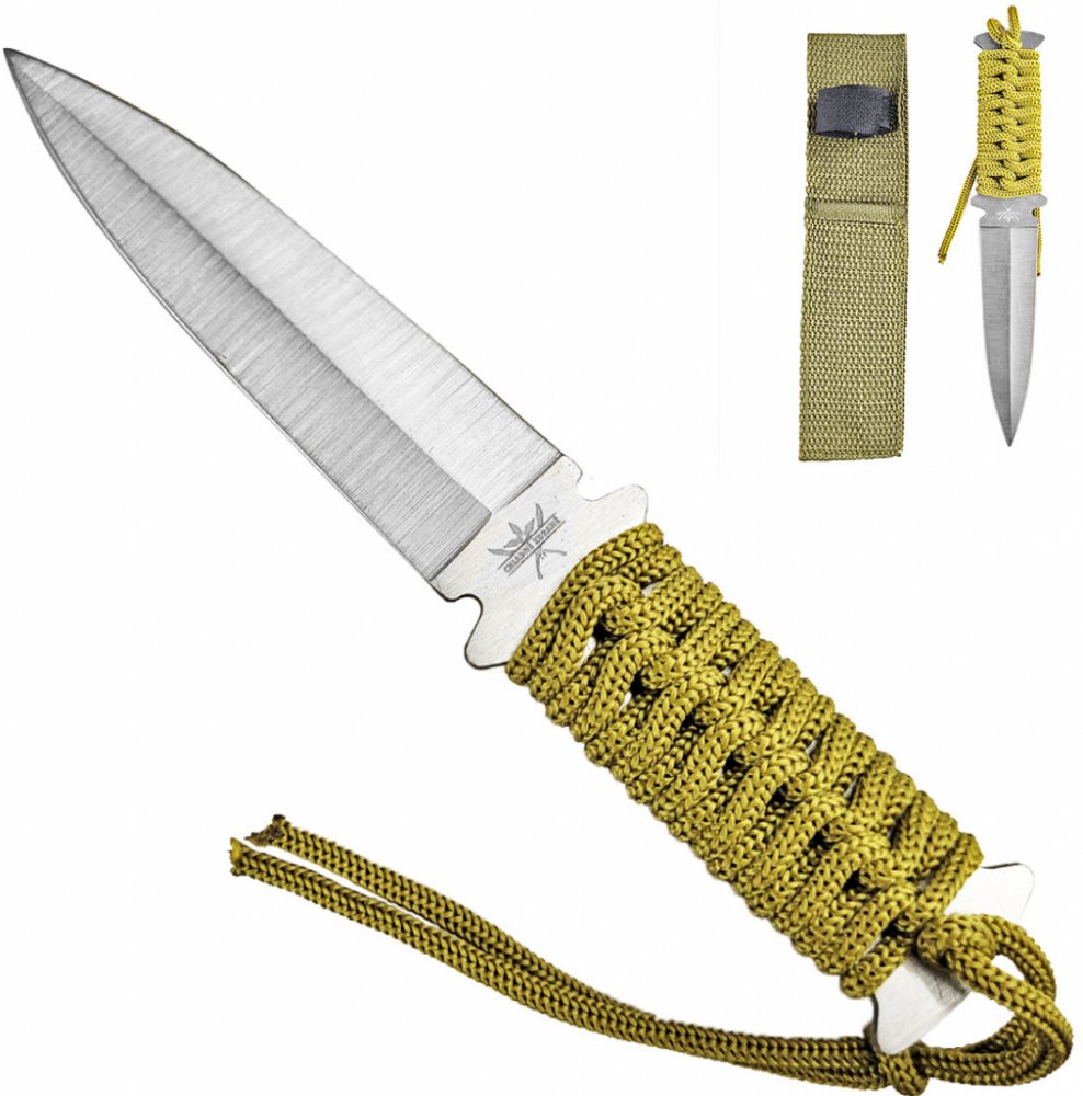 Středně veliký vrhací nůž s obmotanou rukojetí, kde se skrývá více než 1m pevné tkaniny (pro přežití).