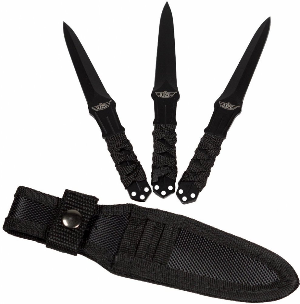 Sada odolných vrhacích celokovových nožů. Jsou vyrobeny z jednoho kusu nerezové černěné oceli. Rukojeť nožů je omotána šňůrou. Délka čepele7,6cm, celková délka15,2cm. Dodáváno s nylonovým pouzdrem.