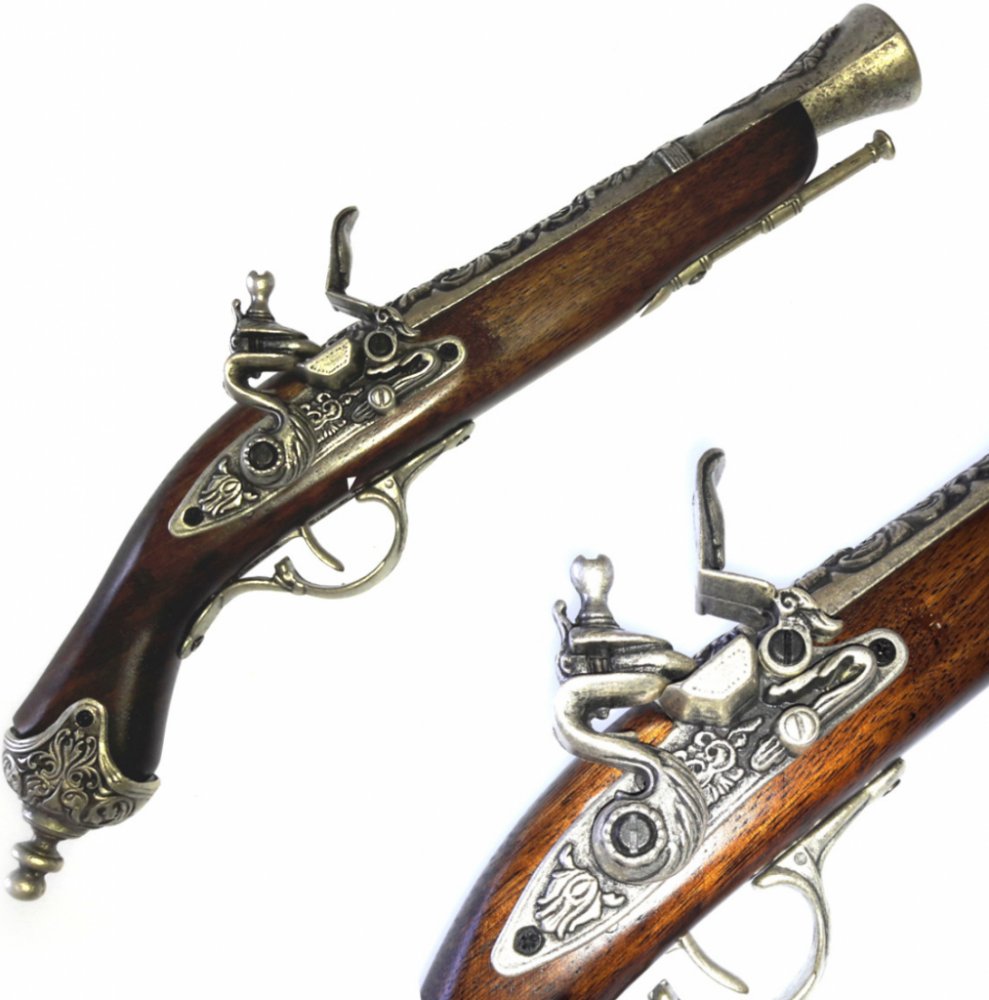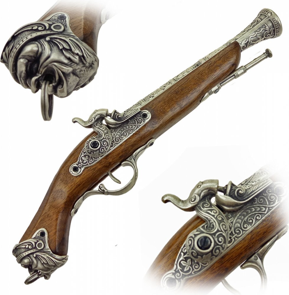 Tato španělská bambitka je jako vystřižená z filmu Piráti z Karibiku - jen přidat střelný prach! :-) Poctivé provedení po všech směrech ji předurčuje k dekoračním účelům, zrovna tak jako k nošení u opasku při rekonstrukcích bitev a dalších historických akcích. Tělo pistole je z krásného lakovaného dřeva, hlaveň, nátažný mechanismus, spoušť a detaily pak tvoří vintage působící stříbrný kov. 100% made in Italy!