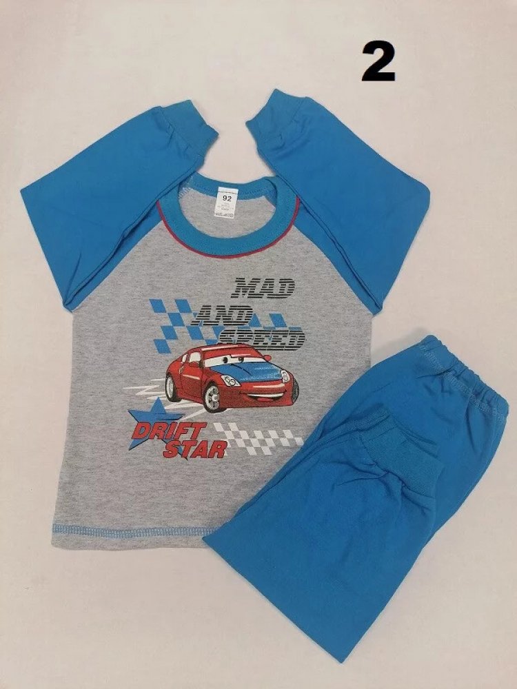 Dětské pyžamo pro malé kluky s dlouhým rukávem a dlouhými kalhotami ukončené patentem, vyrobeno ze 100% bavlny, motiv - auta. Dostupné ve více barevných kombinacích s různým potiskem.