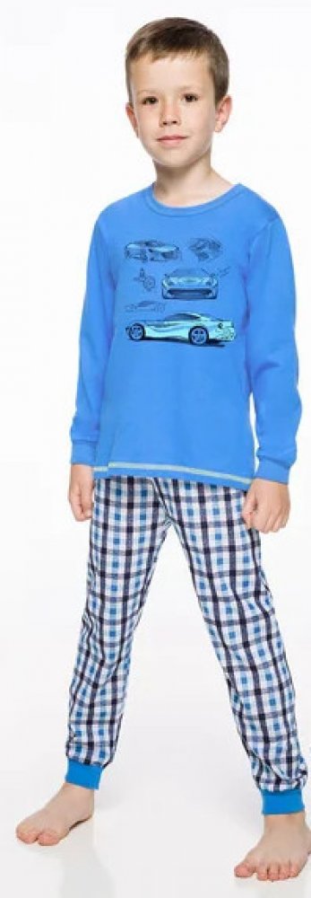 Barevné bavlněné pyžamo s dlouhým rukávem a kalhotami pro kluky, jednobarevný horní díl s obrázky aut, spodní díl károvaný as volnější gumou.