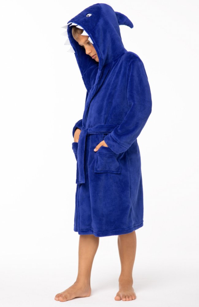 Chlapecký župan, s jediněčným vzorem - Žralok. Župan, na každé roční období, je vyroben z měkkého a hřejivého materiálu. Pohodlný střih, se zavazováním v pase, s kapsami po bocích a kapucí, imitující hlavu žraloka, s čelistmi a ploutvou. Vzor je dotvořen fleecem a vyšívanými detaili.