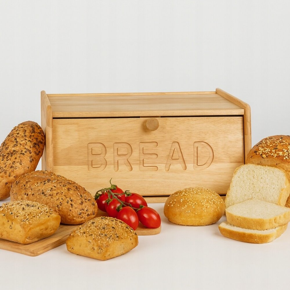 Dřevěný, elegantní chlebník zajišťuje delší trvanlivost uloženého pečiva. Prezentovaný chlebník je vyroben z vysoce kvalitního kaučukového dřeva. Vyznačuje se výjimečnou odolností vůči vodě, hustým zbarvením a kompaktní strukturou, což mu dodává vynikající tvrdost a pevnost. Chlebník má dvířka s pohodlným úchytem pro otevírání.