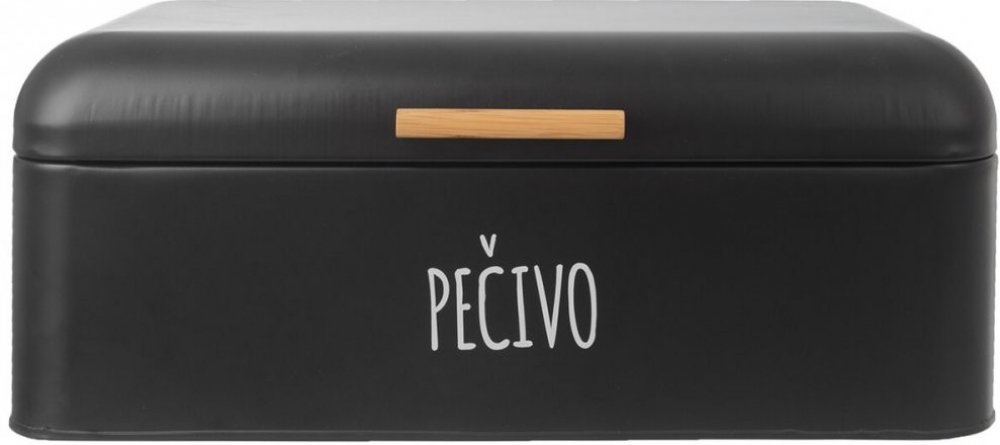 Podrobnosti o produktu OR153682 Plechová chlebovka v černé barvě, se stylovým názvem PEČIVO na přední straně a výklopným víkem s bambusovou rukojetí, bude stylovým uložením čerstvého pečiva na kuchyňské lince.