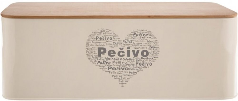 V případě této plechové chlebovky, která slouží k uskladnění chleba, rohlíků nebo housek, je hlavním nápisem slovo PEČIVO. Součástí je i dřevěné víčko, které můžete využít zároveň jako kuchyňské prkénko na krájení nebo jako podložku pod horký hrnec.
