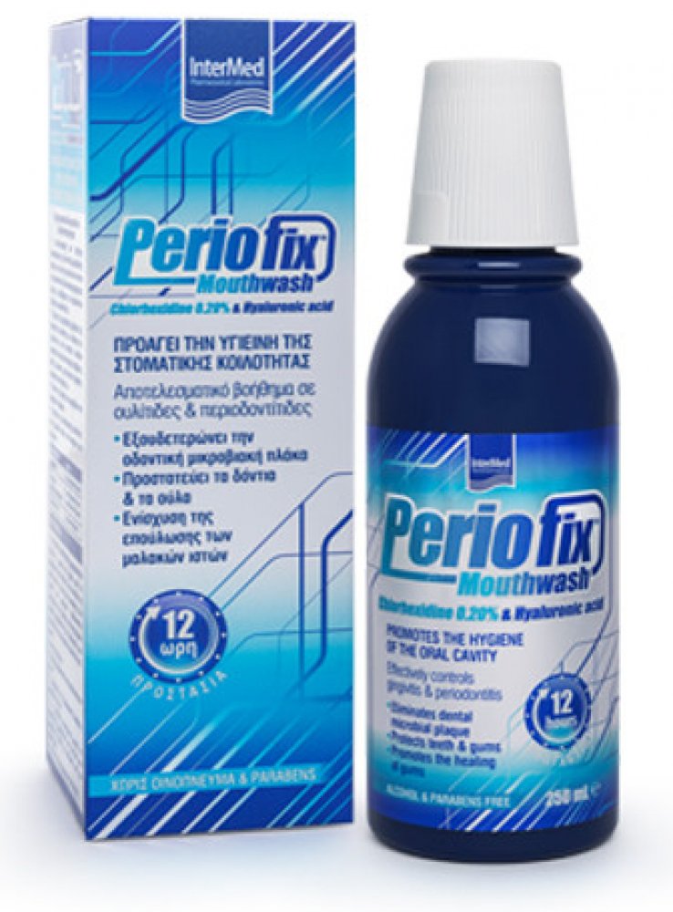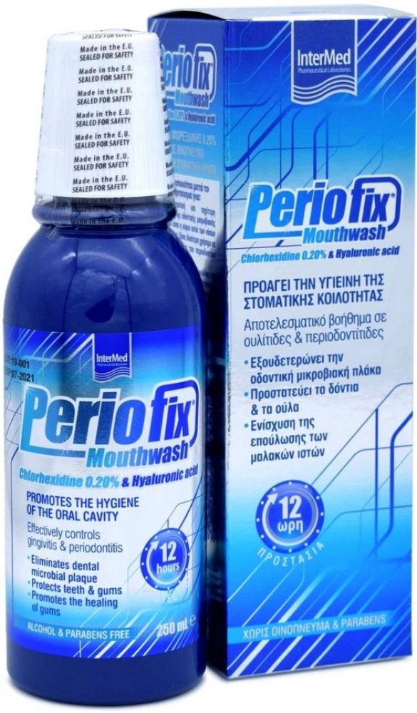 Ústní voda Chlorhexil PerioFix s obsahem chlorhexidinu 0,20 %, kyselinou Hyaluronovou a heřmánku eliminuje bakterie v ústech, je účinná proti zubnímu plaku a poskytuje okamžitou úlevu a ochranu ústní dutiny před podrážděním a zánětem dásní. Složení je obohaceno o kyselinu hyaluronovou, která přirozeně uchovává vlhkost v dutině ústní.Je vhodná po chirurgických zákrocích, extrakcích (trhání zubů) n...