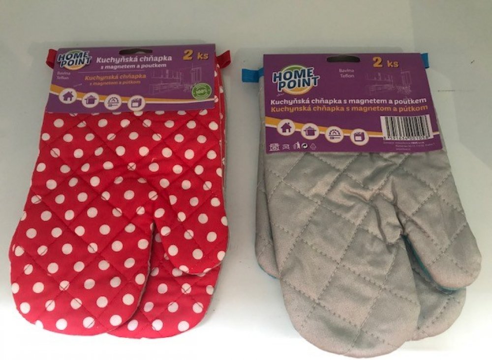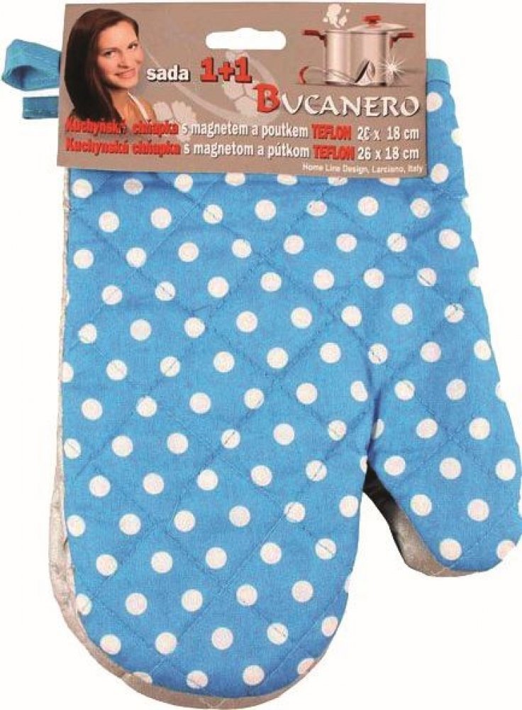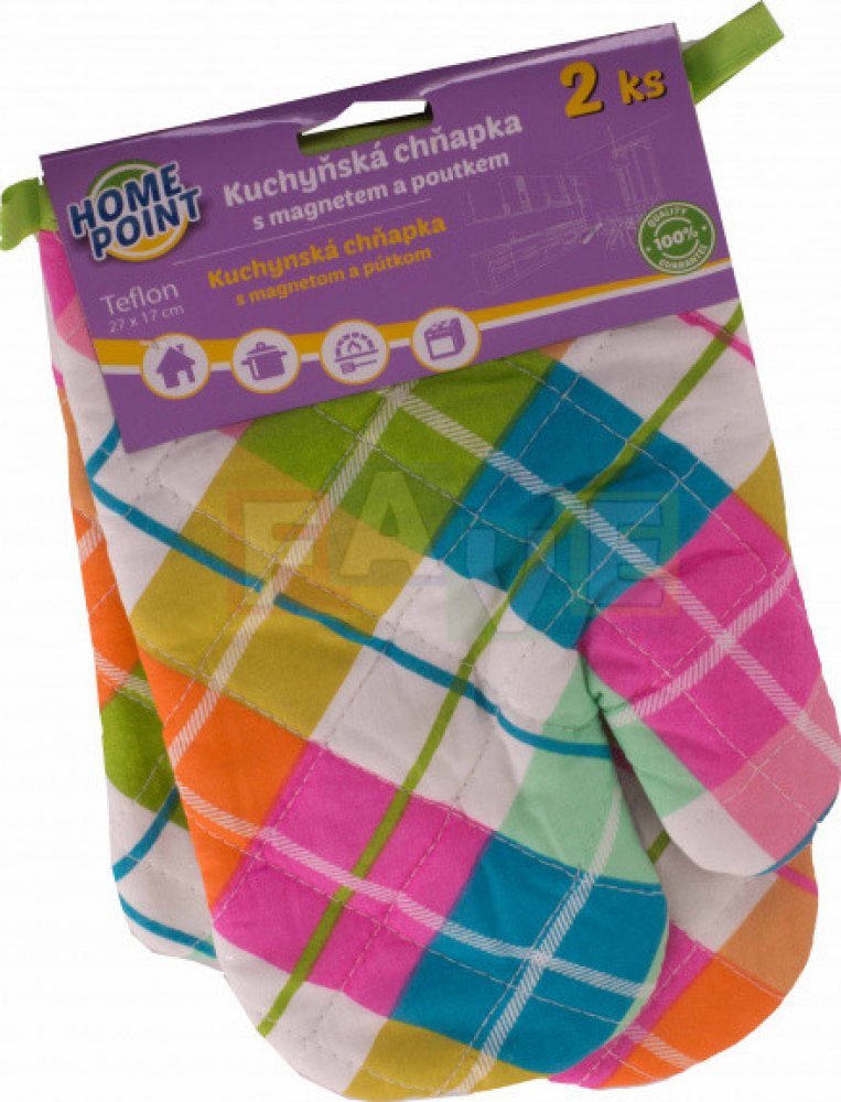 Kuchyňská chňapka sada 2ks levá+pravá s magnetem a poutkem TEFLON je z jedné strany teflonová a z druhé bavlněná. Oddolnost do 230 C. Mix barev: červaná puntík, oranžová puntík, zelená puntík, modrá puntík, barevná-proužek, barevná-karo