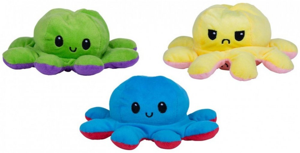 POPIS PRODUKTU Roztomilá plyšová chobotnice, která na Vaší tváři zaručeně vykouzlí úsměv. Jedna strana se stále usmívá pro dobrou náladu ale pokud ji převrátíte naruby uvidíte naštvanou a zamračenou chobotničku. Každá strana je rozdílně barevná a k dispozici máme spousty barevných variací. Dejte partnerovi najevo jak se zrovna cítíte a dejte chobotničku na viditelné místo! Úžasný dárek. Materiál: Příjemná plyšPlyšák chobotnice, 20 cm