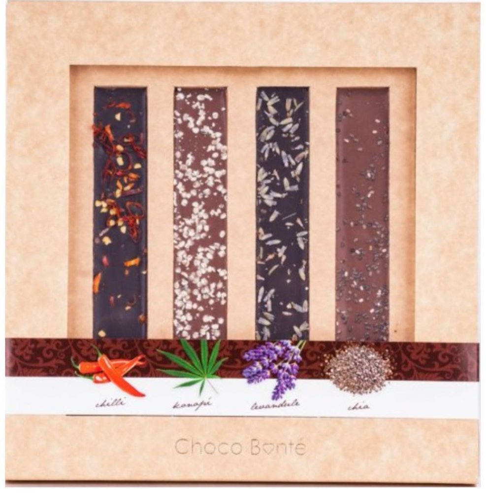 Choco Bonté Pásky hořké a mléčné čokolády chilli, levandule, chia, konopí 60 g